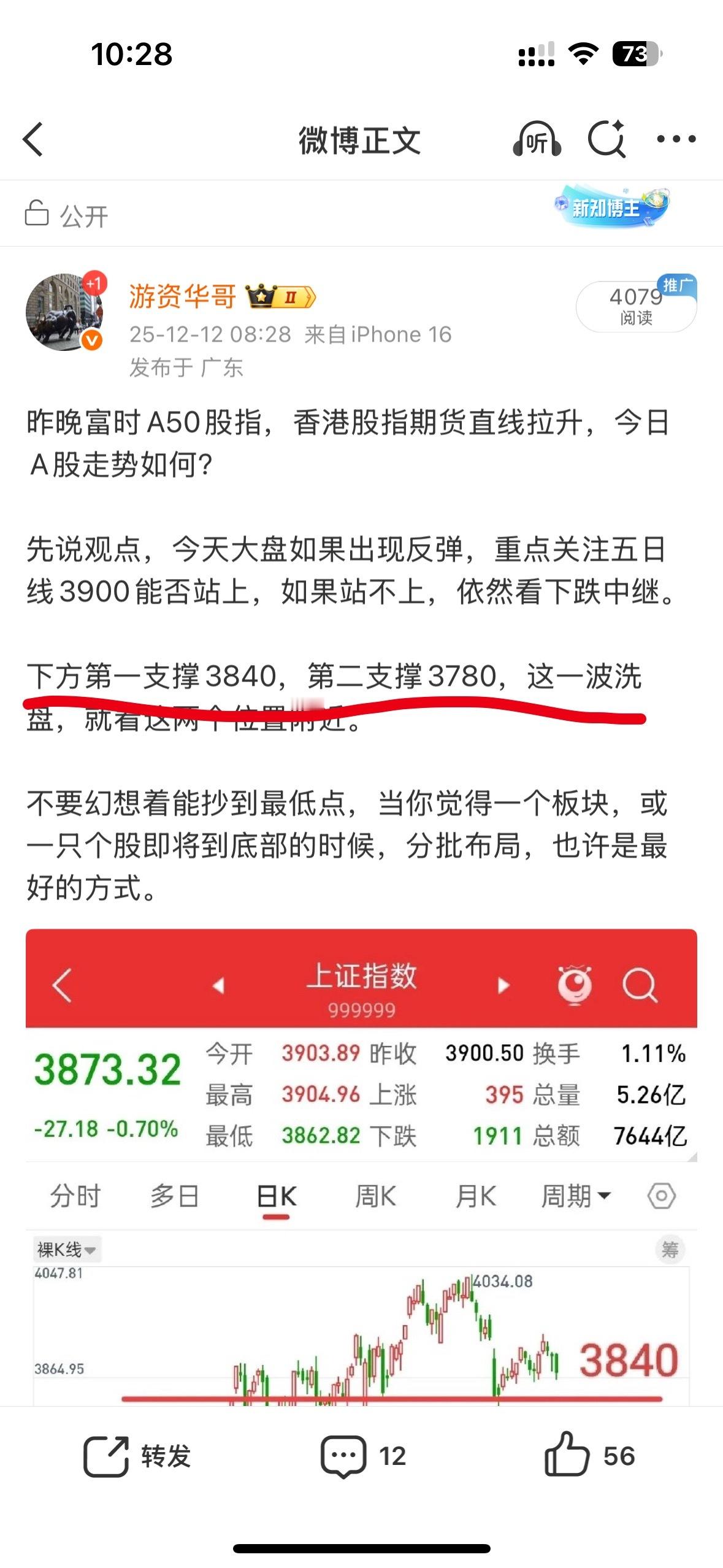 A股,机会都是跌出来的,珍惜每一次下跌时的机会!从前天下午提示,每一次降息,当天上午十点半之前大概都会见高点,然后洗盘,砸出黄金坑,开启新一波行情,9.18号是第一次,10.30号是第二次,昨天是第三次。先说观点,今早也说了,洗盘位置大概3840,3780两个位置。激进一点的,3850下方就可以陆陆续续分批进场了。稳健的话,就等。还是那句话,控制仓位的前提下,分批低吸,而不是一心想着抄在最低点,没有人知道最低点。