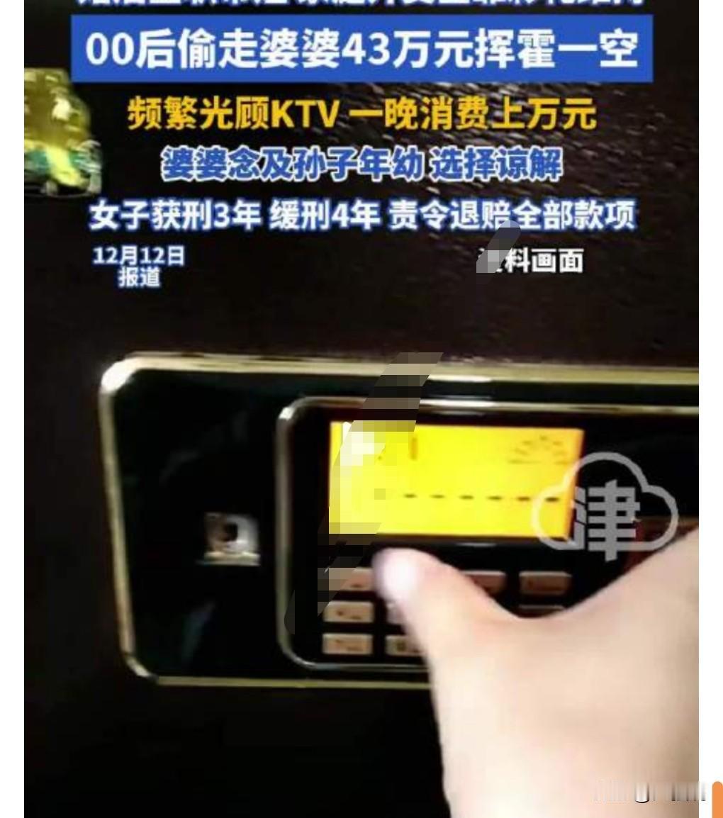 摊上这么个儿媳妇,真的是太悲哀太败家了。 12月12日,我上网看到这么个消息。 00后女子因积怨偷婆婆43万花光。 频繁光顾KTV,1晚上消费上万元。 这真的是太坑人了。 而这个婆婆只能选择原谅,因为孙子年幼,离不开母亲。 谁叫是自己的儿媳。 女子被判有期徒刑三年,缓刑4年,退赔所有款项。 值得一提的是她老公也不给力,也不出去工作,所以她做出这样的行为,但这种行为本身就是违法行为啊。