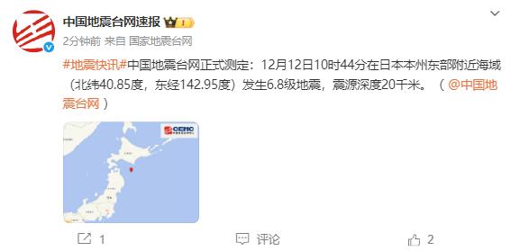 12月12日,据央视新闻报道,今天上午10点44分,日本本州东部附近海域发生6.8级地震,震源深度20公里,位于北纬70.85度,东径142.95度。 暂时没有报告海啸的消息,6.8级地震属于强震,极有可能引发海啸。