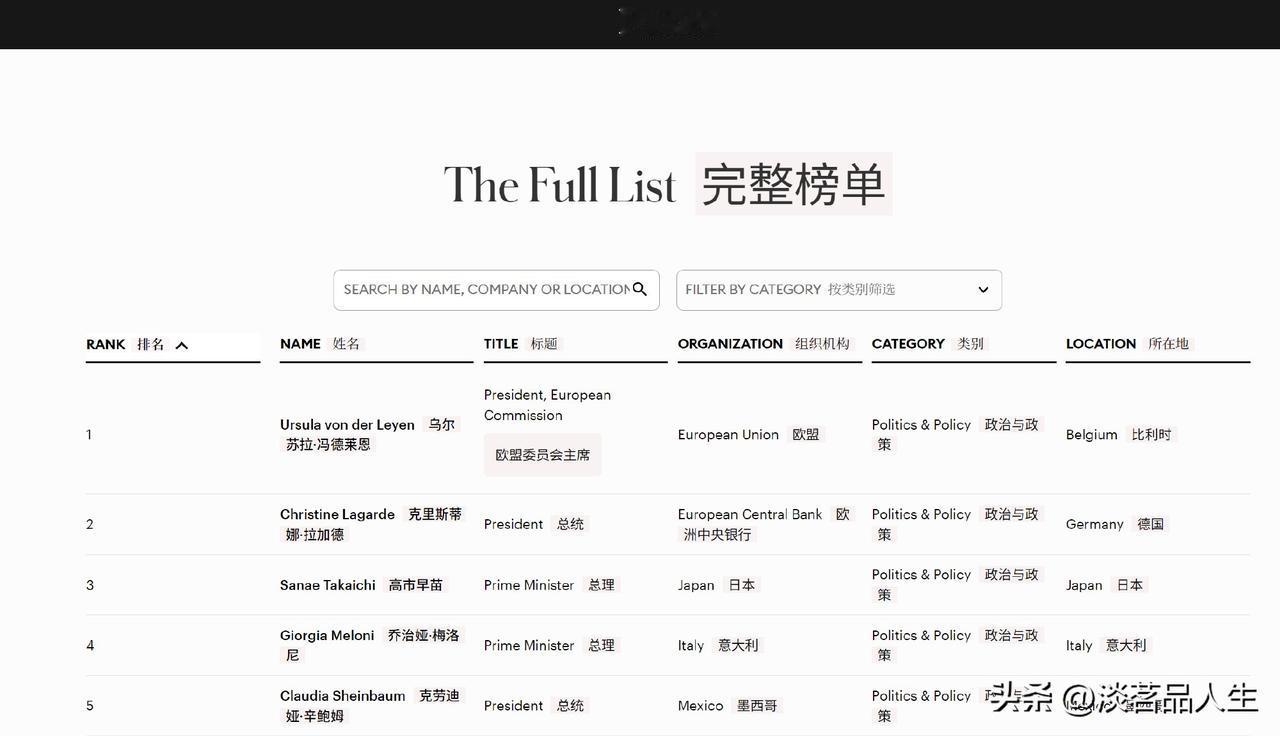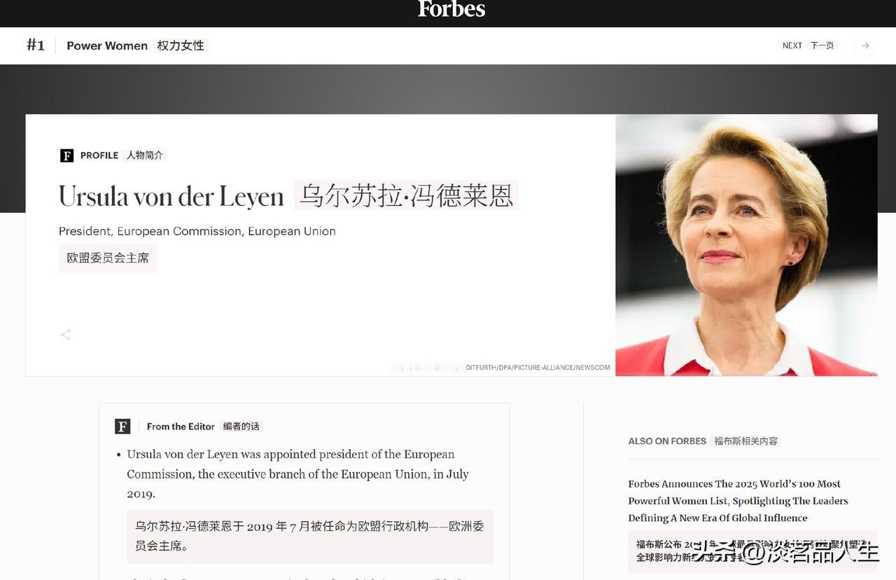 福布斯杂志出了一个排行榜——2025年全球最具影响力女性百强排行榜,高市居然排在了第三位,上台不到两个月的能排到第三,也算是见证奇迹了。 而排在第一位更是让你大跌眼镜的冯德莱恩,这位奇女子凭借自己的实力把欧洲带的越来越“出色”。让她排在首位,看来正合福布斯的心意。 最惊讶的是卡拉斯并没有排在前几位,这位奇女子一点不输冯德莱恩,可能除了生孩子没有冯德莱恩多以外,其他的领域都能和冯德莱恩竞争一下。 福布斯的榜首位置应该给白宫发言人莱维特,莱维特既漂亮又能说,发言人做的风生水起,拿下榜首才是众望所归。
