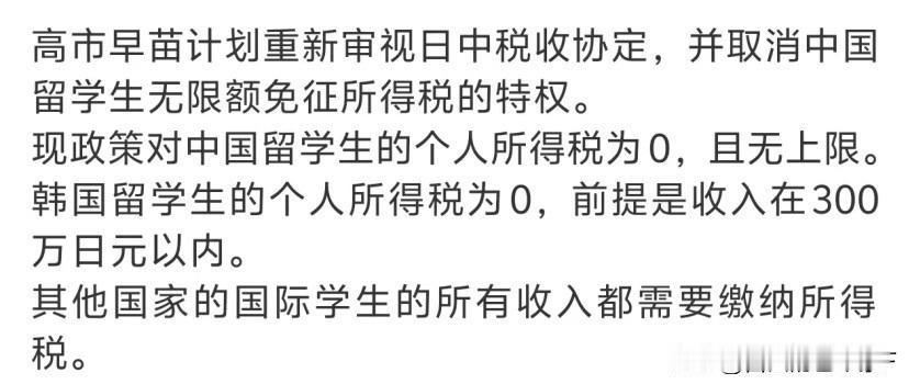 过分了,高市对中国留学生一刀切,还盯上了跨境电商 12月12日,根据日本媒体报道,随着中日纷争的继续,中方叫停对日旅游后,高市政府决定对华发起反制,目前高市内阁打算对华发起2种制裁 1、高市准备叫停对中国留学生42年的免税特权,此举意味着超12万在日中国留学生,打工收入将需要同日本缴纳所得税 2、与此同时,高市还准备对中国的小额跨境电商征税。 评价两句:所有的操作手段几乎和美国还有欧洲保持一致,他低估了日本对中国的依赖程度,在反制中国的同时无疑与再一次的加重了日本内部的通胀。