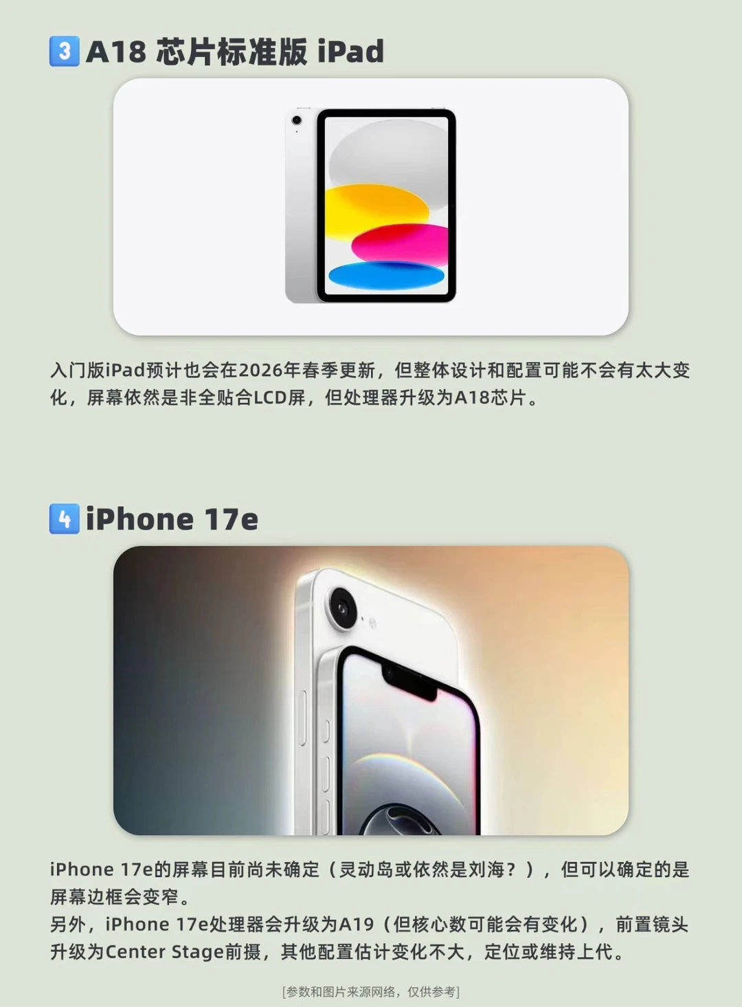 入门版iPad预计也会在2026年春季更新,但整体设计和配置可能不会有太大变化,屏幕依然是非全贴合LCD屏,但处理器升级为A18芯片。
