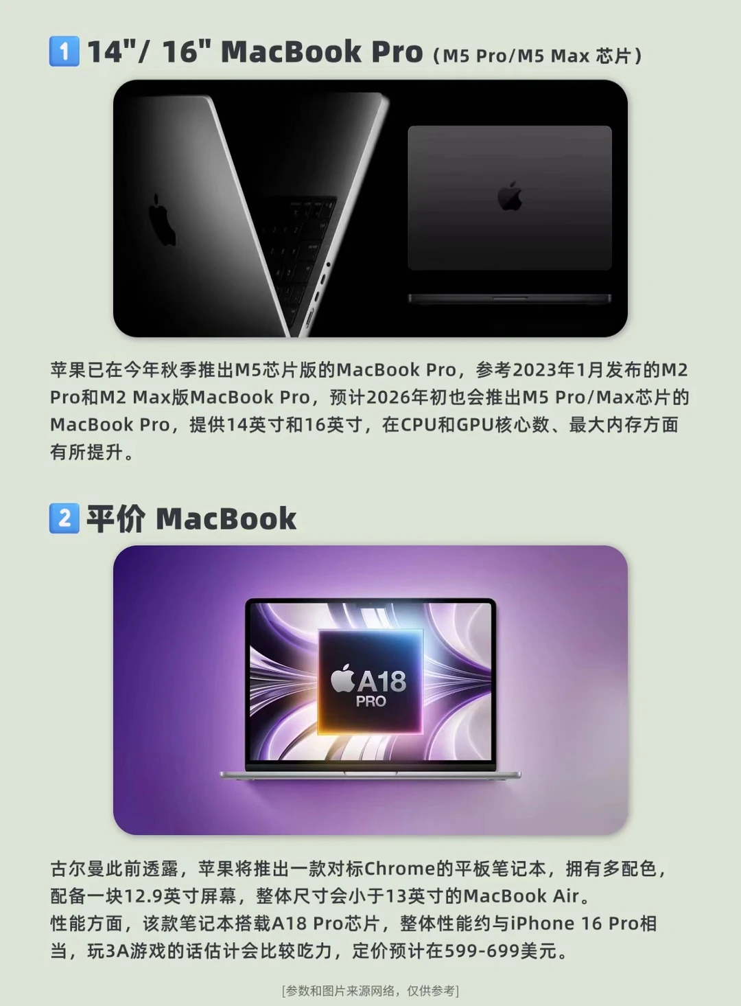 苹果已在今年秋季推出M5芯片版的MacBook Pro,参考2023年1月发布的M2 Pro和M2 Max版MacBook Pro,预计2026年初也会推出M5 Pro/Max芯片的MacBook Pro,提供14英寸和16英寸,在CPU和GPU核心数、内存方面有所提升。