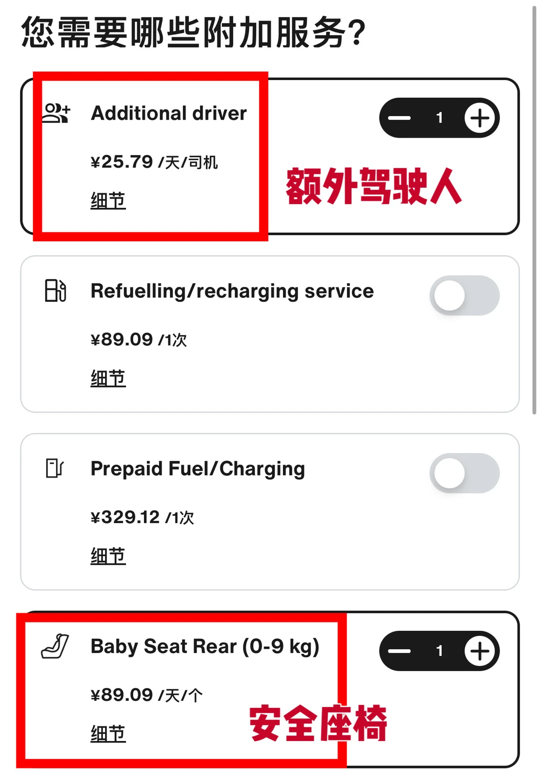 ⚠️注:如果携带七岁以下儿童,预订时记得勾选安全座椅18刀/天,也可以自行购买(kmart 49刀)。如果有多名驾驶者,会有一个additional driver的费用大概是5刀每天,这个也要选上,否则其他司机驾驶会被罚款。(图4)