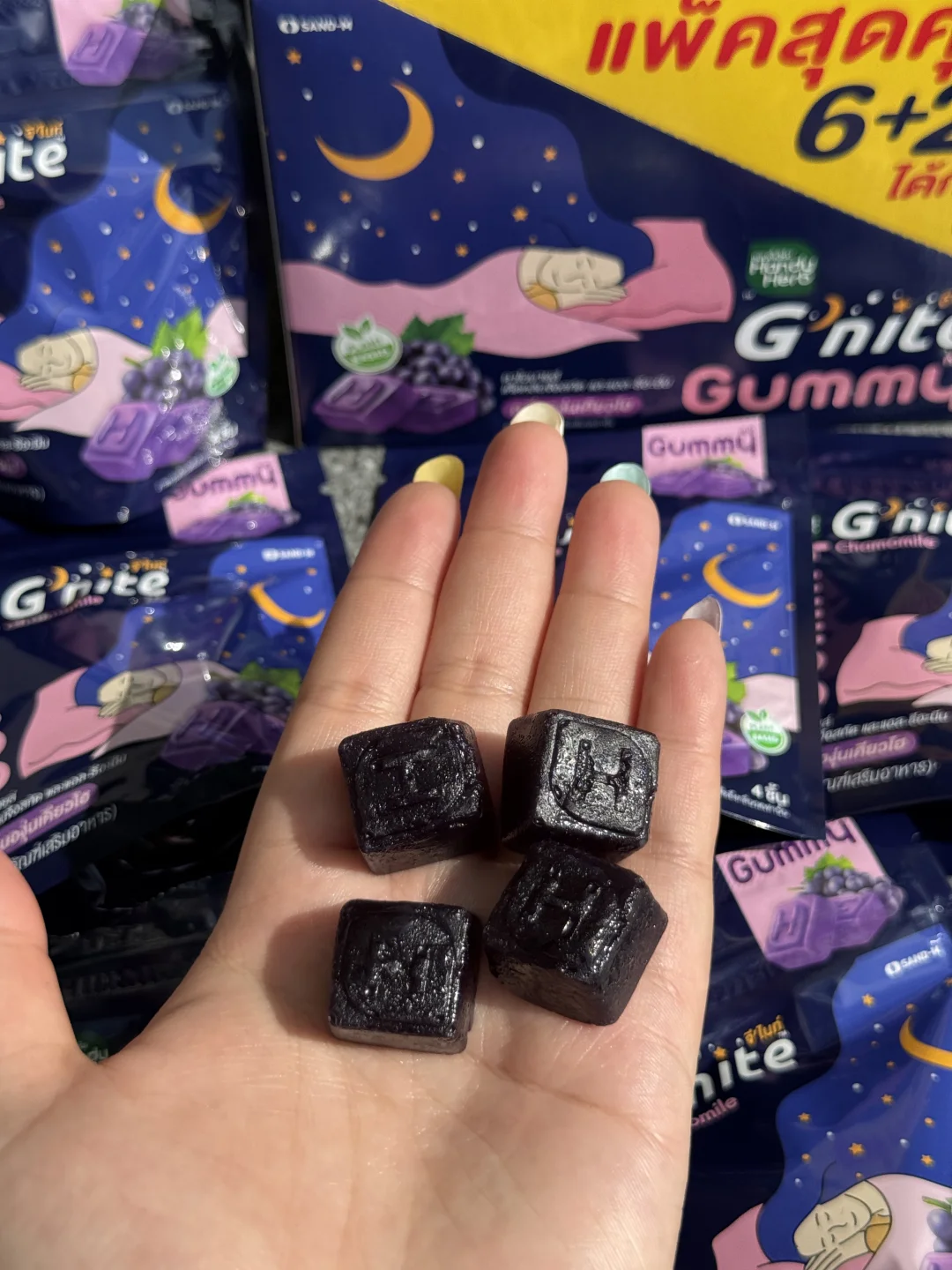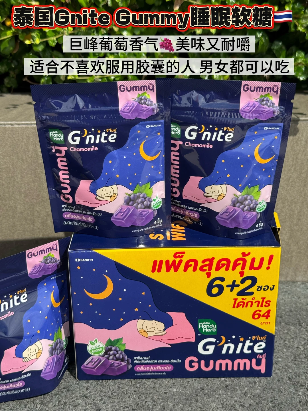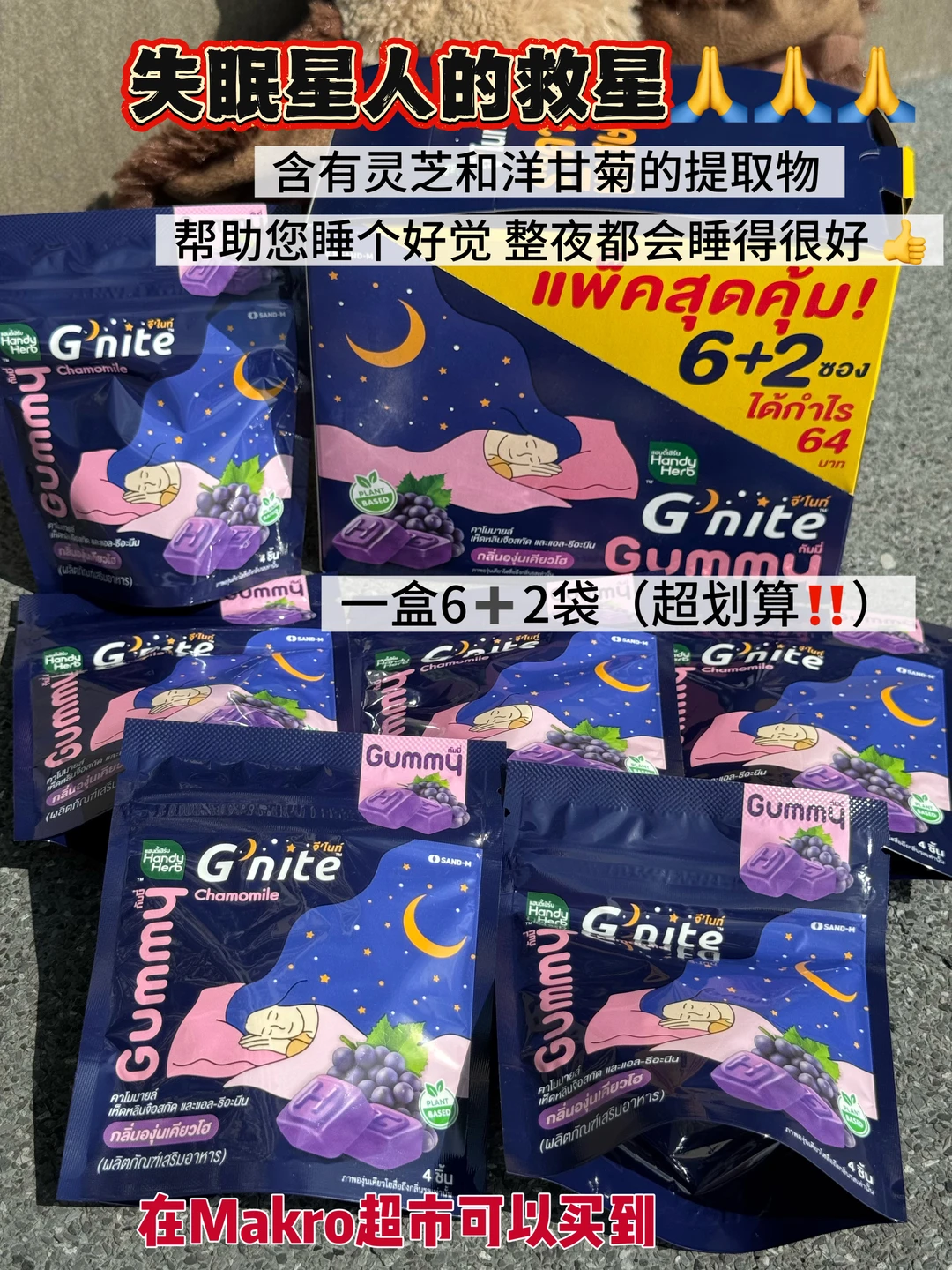 姐妹们!我回购一万次的G'nite睡眠软糖在Makro上新啦!这次还是超划算的套装哦! 🍇G'nite Gummy睡眠软糖 一包4片才40泰铢,睡前嚼2片超得劲~ 巨峰葡萄味yyds,QQ弹弹的,不爱吞胶囊的闭眼冲,谁吃谁好睡💤 📍划重点:泰国Makro超市就能买! 一盒6袋+2袋的组合装超划算!逛Makro的姐妹千万别错过,闭眼囤就完事~