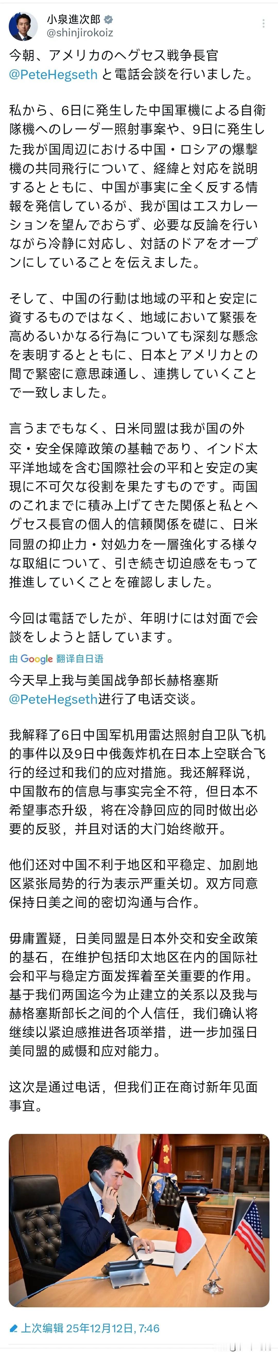 日本防卫大臣小泉进次郎今天(12月12日)发文写道:“今天早上我与美国战争部长赫格塞斯进行了电话交谈。我解释了6日中国军机用雷达照射自卫队飞机的事件以及9日中俄轰炸机在日本上空联合飞行的经过和我们的应对措施。我还解释说中国散布的信息与事实完全不符,但日本不希望事态升级,将在冷静回应的同时做出必要的反驳,并且对话的大门始终敞开。 他们还对中国不利于地区和平稳定,加剧地区紧张局势的行为表示严重关切……1日美同盟是日本外交和安全政策的基石,在维护包括印太地区在内的国际社会和平与稳定方面发挥着至关重要的作用。基于我们两国迄今为止建立的关系以及我与赫格塞斯部长之间的个人信任,我们确认将继续以紧迫感推进各项举措,进一步加强日美同盟的威慑和应对能力。这次是通过电话,但我们正在商讨新年见面事宜。” 评几句 小泉这通电话,与其说是“通报”,不如说是“哭诉”:把自家侦察机贴脸偷窥被锁定、把中俄轰炸机在国际空域正常巡航,包装成“受害实录”,一把鼻涕一把泪地往华盛顿热线里倒。 东京如今的外交脚本只剩三幕:第一幕,主动碰瓷;第二幕,回头哭诉;第三幕,拉着美国拍照留念。演得多了,连自己都信了“受欺负”的人设,却忘了镜头外世界看得清清楚楚——是谁把雷达开到别人鼻子底下?是谁把“专属通道”硬说成“领空被穿”? 日美同盟再粗的铁链,也拴不住地理常识:东海不是华盛顿的池塘,第一岛链更不是日本的护城河。真想让地区降温,先把自家侦察机的航线从别人家门口撤回去;否则打再多的电话,也不过是话费越贵,观众越腻,且毫无成果。