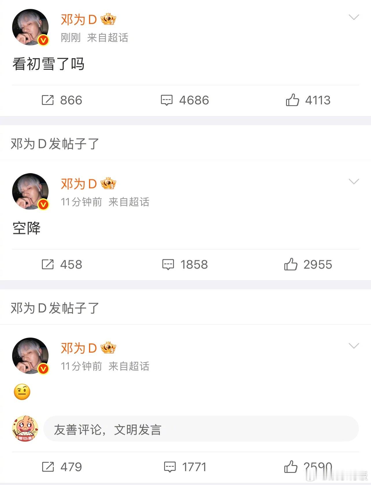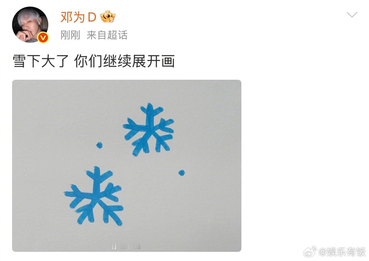 邓为手绘初雪这和邓为一起看初雪有什么区别 呜呜初雪这天,我们也遇到了浪漫的神!开心的和大家分享初雪,考虑到有人可能没看到,就手绘了雪花给大家,这和邓为一起看了初雪有什么区别邓为
