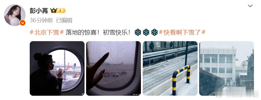 彭小苒晒北京初雪 刚落地就遇到了北京的初雪!姐姐第一时间发微博跟粉丝们分享也太浪