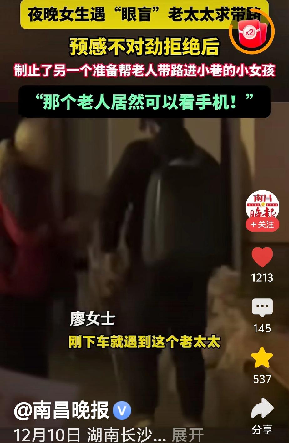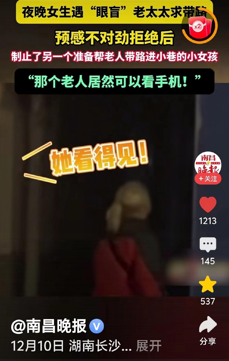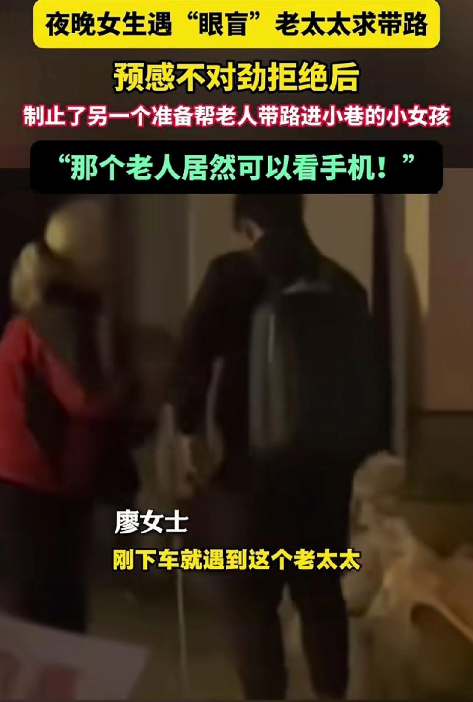 单身女孩子出门,一定要留个心眼,要学会分析事情,不要大大咧咧,什么都相信,有时候看着是做好事,其实可能是陷阱。 最近,湖南长沙,一位女士晚上出门,遇到一位眼盲老太太求带。女士本来想帮助她,可是考虑到老太太是让人把他往小巷子里带,并且她只找女的帮忙,不找男的帮忙。感到很可疑,就拒绝了她。 然后,老太太就又找了一个小姑娘,要求小姑娘把他带进小巷子,于是女士赶紧阻止了小姑娘。 后来,两人悄悄跟踪老太太,发现她竟然能够自己看手机,眼盲可能是装的。 女士感到后怕,联想到平时那么多失踪的女子,怀疑这人目的不纯。为了避免有人受到欺骗,于是就拍了视频发到网上,提醒大家注意。 评论区有人说,不要在网上发这种负面的消息,人们看到以后,就不会有人去帮助,有需要帮助的人了。 我觉得这位网友也不对,虽然是站在了需要帮助的人的立场上说这话是不假,但是这样也给善良的人埋下了雷。 这位老太太真的很可疑,如果真的是眼盲的人,他的眼睛不行,嗅觉或者是记忆力一定非常好,有没有灯光,他也会自己找回到自己的家。如果他真的没有能力自己走回家,她的家人也不会放任她自己一个人外出。 人心向善,我们鼓励大家做好事。做好事可以,但是做好事的前提,要保证自己的安全。