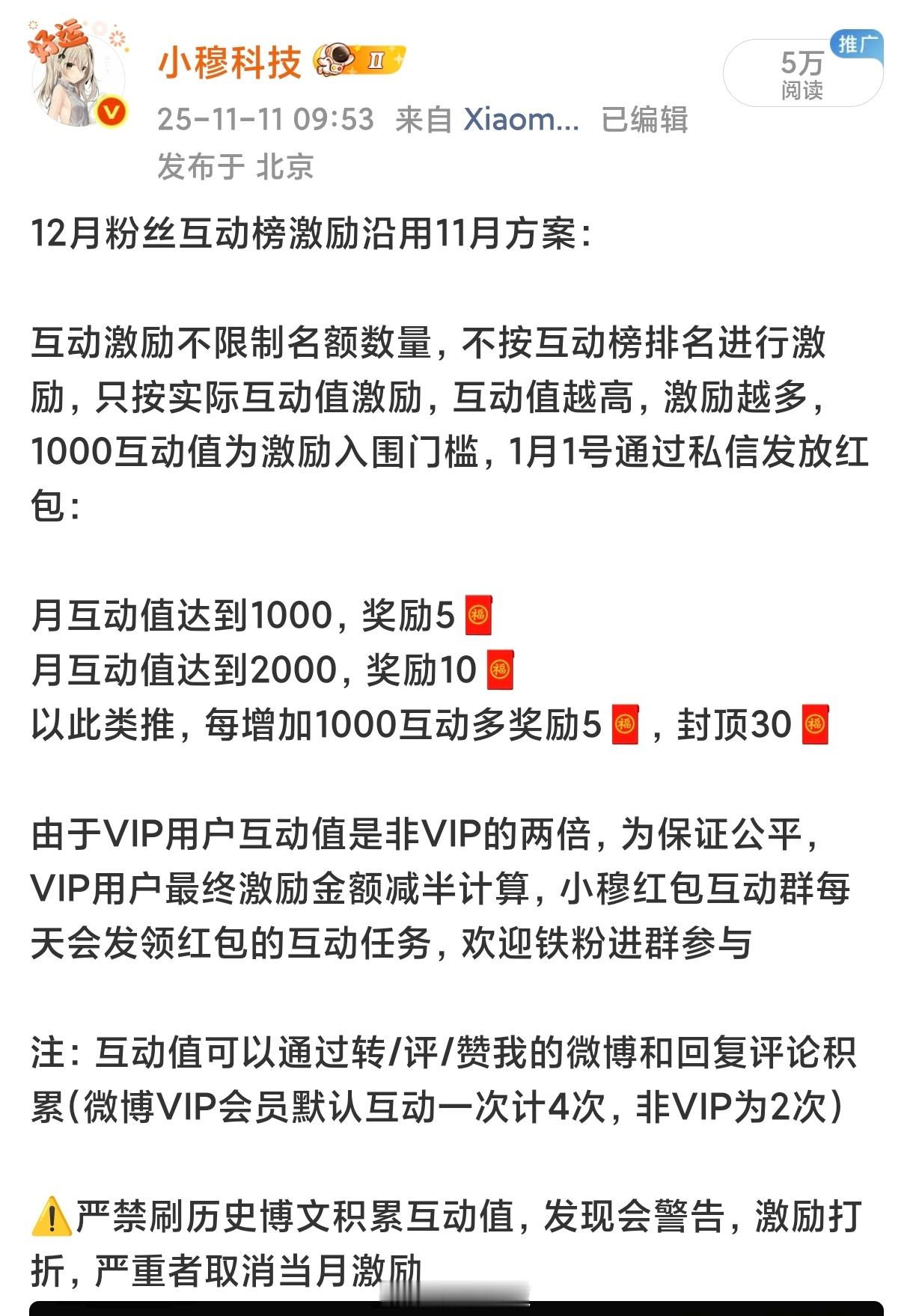 12月激励方案:互动激励不限制名额数量,不按互动榜排名进行激励,只按实际互动值激励,互动值越高,激励越多,1000互动值为激励入围门槛,1月1号通过私信发放红包:月互动值达到1000,奖励5🧧月互动值达到2000,奖励10🧧以此类推,每增加1000互动多奖励5🧧,封顶30🧧由于VIP用户互动值是非VIP的两倍,为保证公平,VIP用户最终激励金额减半计算,小穆红包互动群每天会发领红包的互动任务,欢迎铁粉进群参与注:互动值可以通过转/评/赞和回复评论积累(微博VIP会员默认互动一次计4次,非VIP为2次) ⚠️严禁刷历史月份博文积累互动值,发现会警告,激励打折,严重者取消当月激励