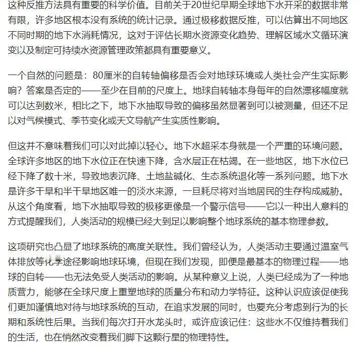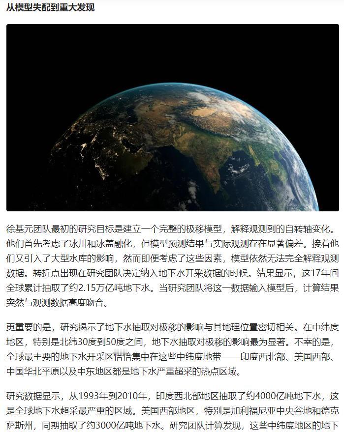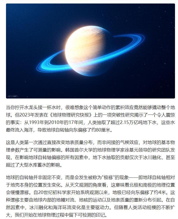 17 年抽光 2.15 万亿吨地下水,竟撬动地球自转?科学家发现颠覆性真相 原文来自:人工智能学家《过去20年整个地球倾斜了0.8米,科学家发现是人类抽水太多》