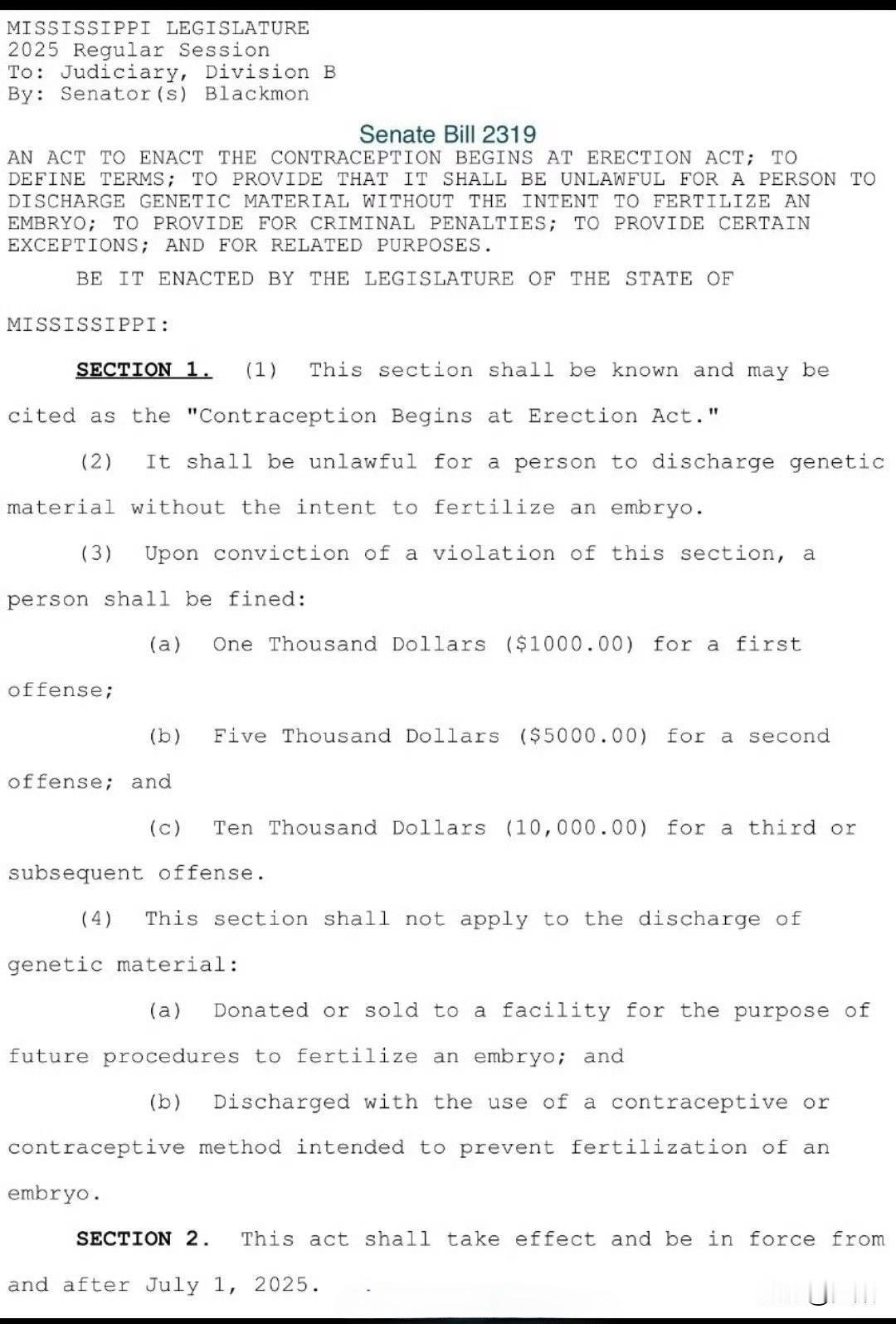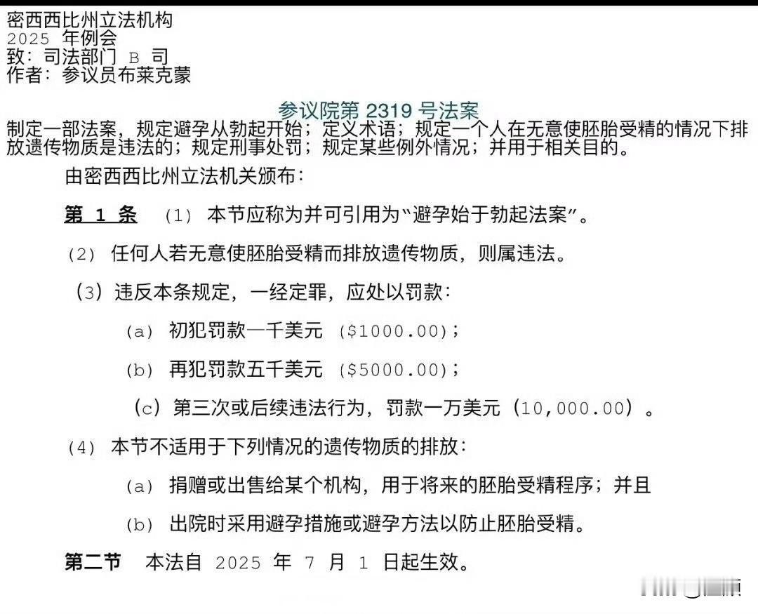 密西西比州推出《避孕始于勃起法案》,变相征收“射精税”,规定男女无意怀孕时男方射精即属违法,初犯罚款1000美元,后续还有其他州计划跟风效仿,堪称广开财源的离谱操作。 知道美国的奇葩税种早已五花八门,乞讨要交税、纹身要交税,连看得到海景的住户都要交风景税,雨水税更是在多个州落地,按房屋不透水面积征收,美其名曰用于排水设施维护。如今这“射精税”更是突破认知,核心争议不仅在于侵犯个人隐私,更在于完全不具备执行可行性。私密场景下的行为缺乏监管依据,是否有怀孕意愿难以界定,全凭主观判断,根本无法有效核查取证。