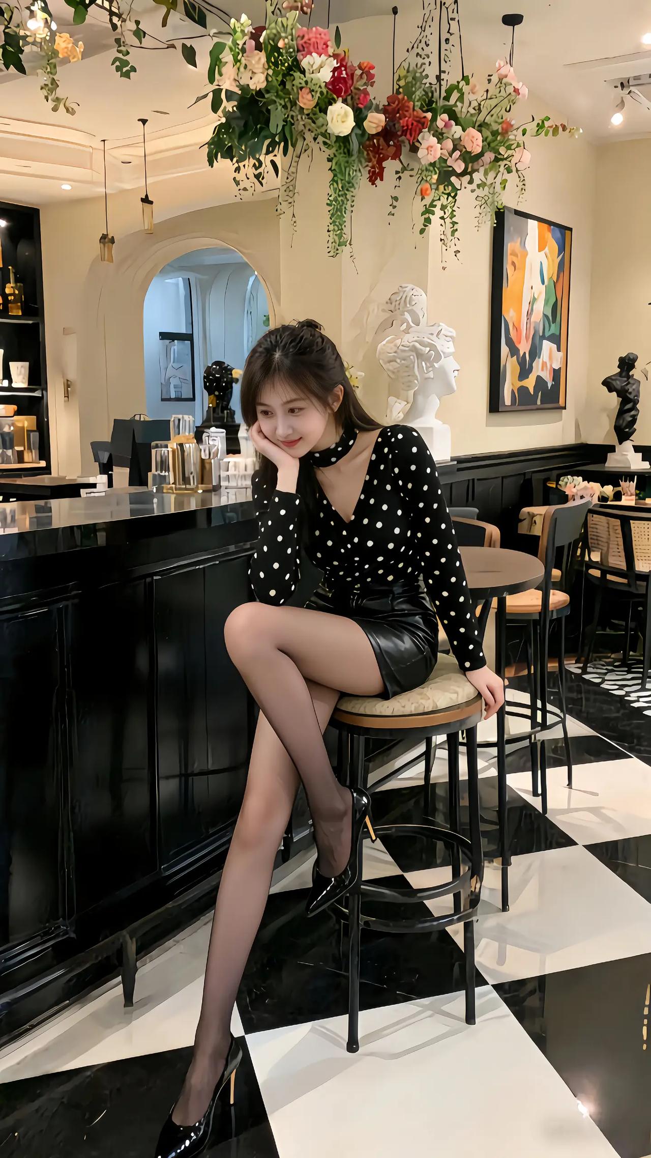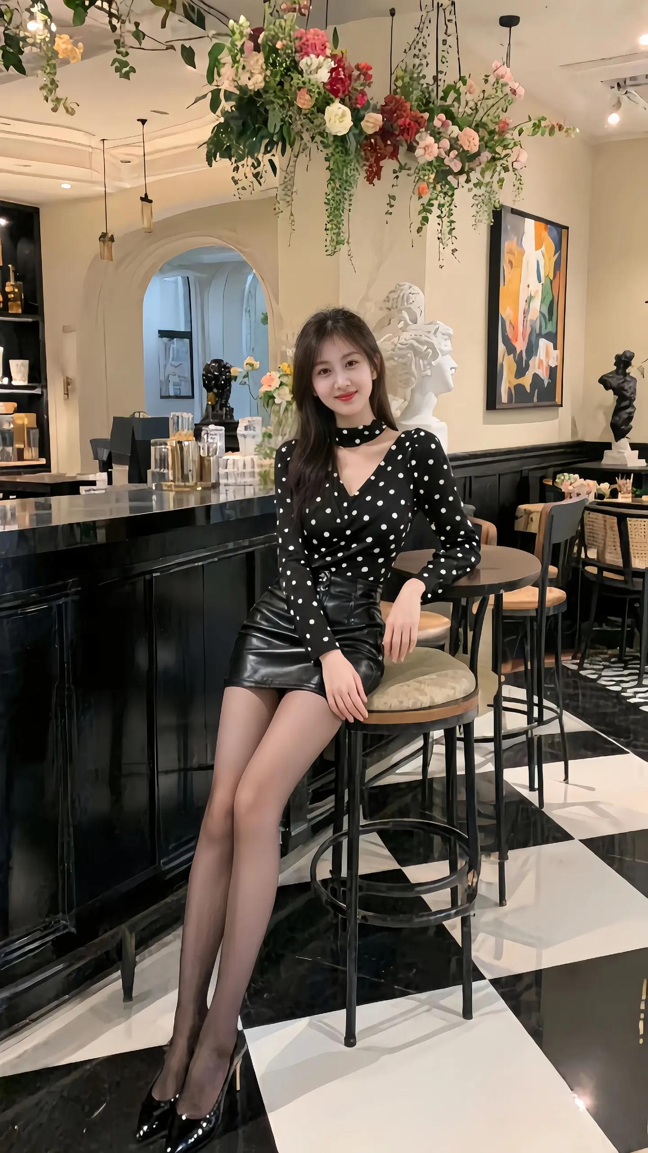 优雅黑皮裙,时尚咖啡馆,甜美笑容,黑白棋盘格,花艺点缀,复古与现代的完美结合。