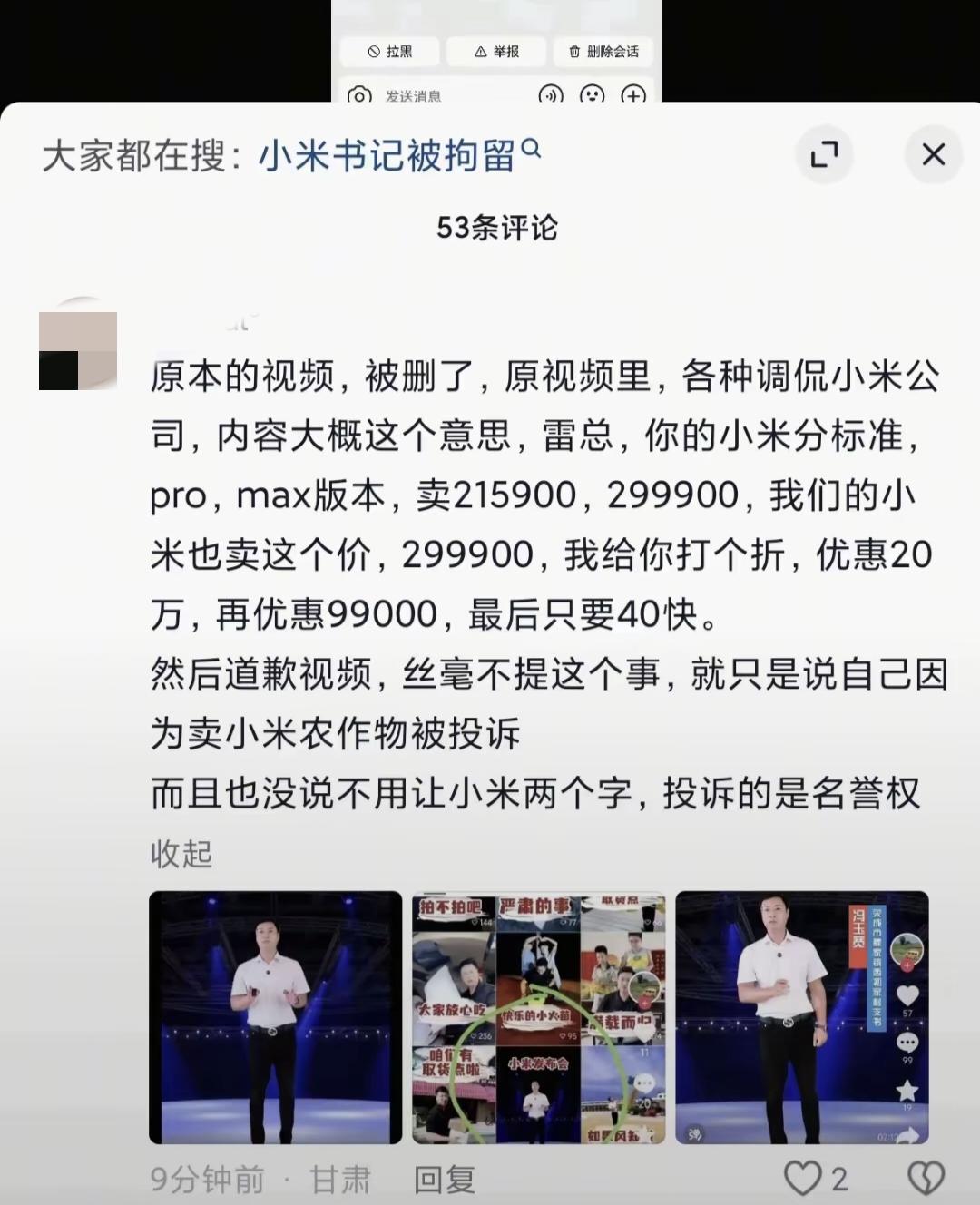 反转了!被小米投诉的村支书太会避重就轻了。其实仔细看一遍原视频就能发现,首先,他挂上了“雷军”、“小米发布会”的标签,这就很容易让一些认知能力低,分辨能力差的人认为是“小米集团”生产销售的小米,投诉他侵犯名誉权一点毛病没有。 其次他还在视频里拿“小米汽车的价格”说事,用自己的“小米谷物”和“小米汽车”关联价格售卖。 甚至还说了“交付只是开始,服务没有终点”这句话,卖个小米用这句话,真的很难不让人联想到“小米公司”。 而他的道歉视频里,对这些只字不提,还喊冤让“小米公司给条活路”,不知情的网友也很快被这句话带偏了! 他说是小米公司不让他用“小米”这2个字,不让他卖小米,这完全是误导,人家投诉他的内容可不是这些。 看了原视频才发现,视频下架都是轻的了。 李富贵就卖小米,为农民赚了钱,得到了全国人民的好评,也没见小米公司投诉她。 目前这位村支书已经修改了账号名,清空了视频,只能说他太不实在了!