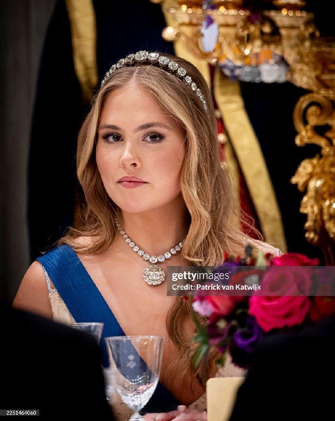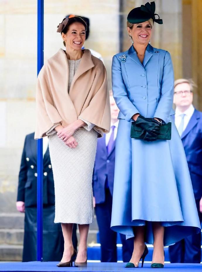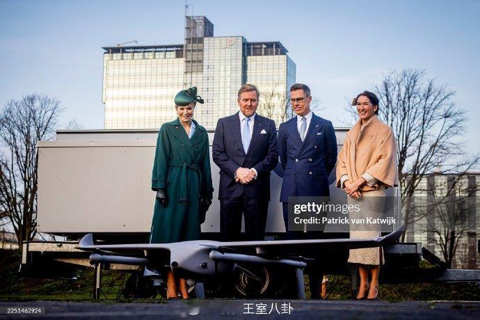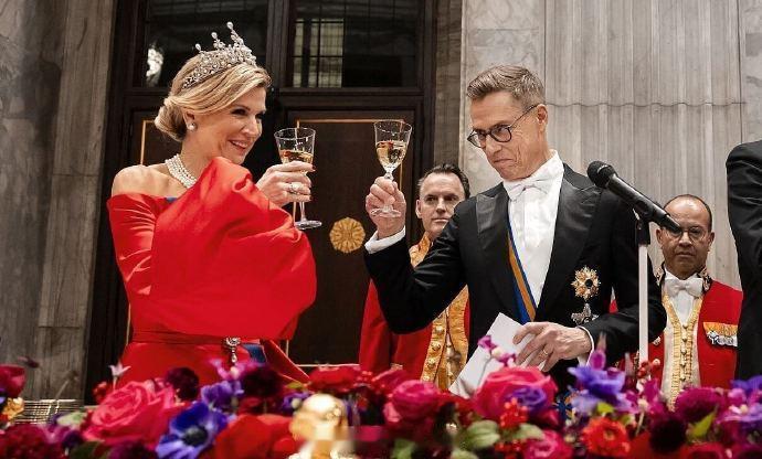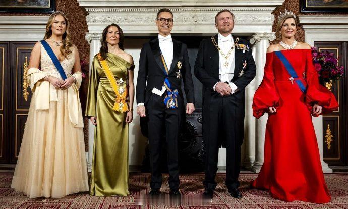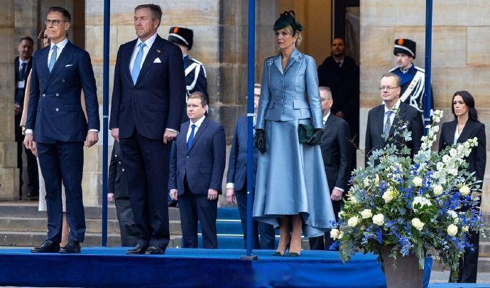 昨天(12月11日),芬兰总统亚历山大·斯图布夫妇开始了对荷兰为期两天的国事访问 日间首先是阿姆斯特丹水坝广场的欢迎仪式,随后四人组去了阿姆斯特丹无人机实验室参观 夜间则是在王宫举行的隆重国宴,荷兰国王威廉-亚历山大和玛克西玛王后以外,还有他们的长女,继承人凯瑟琳娜-阿玛利亚公主参加 玛克西玛日间天蓝色裙子来自natan,搭配海蓝宝珠宝;夜间红色礼服来自Claes Iversen,佩戴大珍珠王冠;阿玛利亚礼服则来自Jenny Packham,佩戴“冰糖”发带