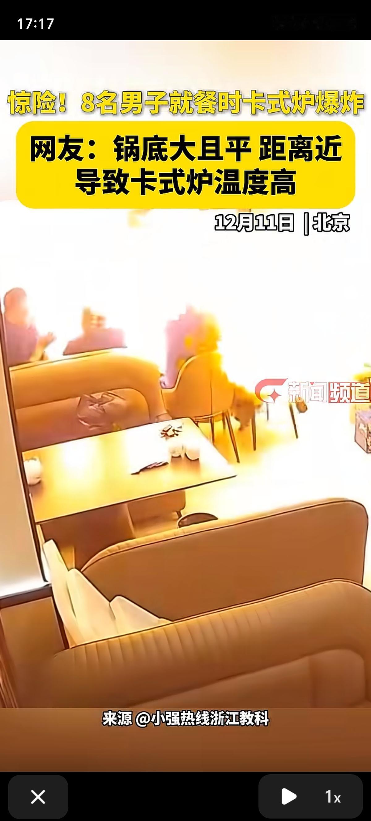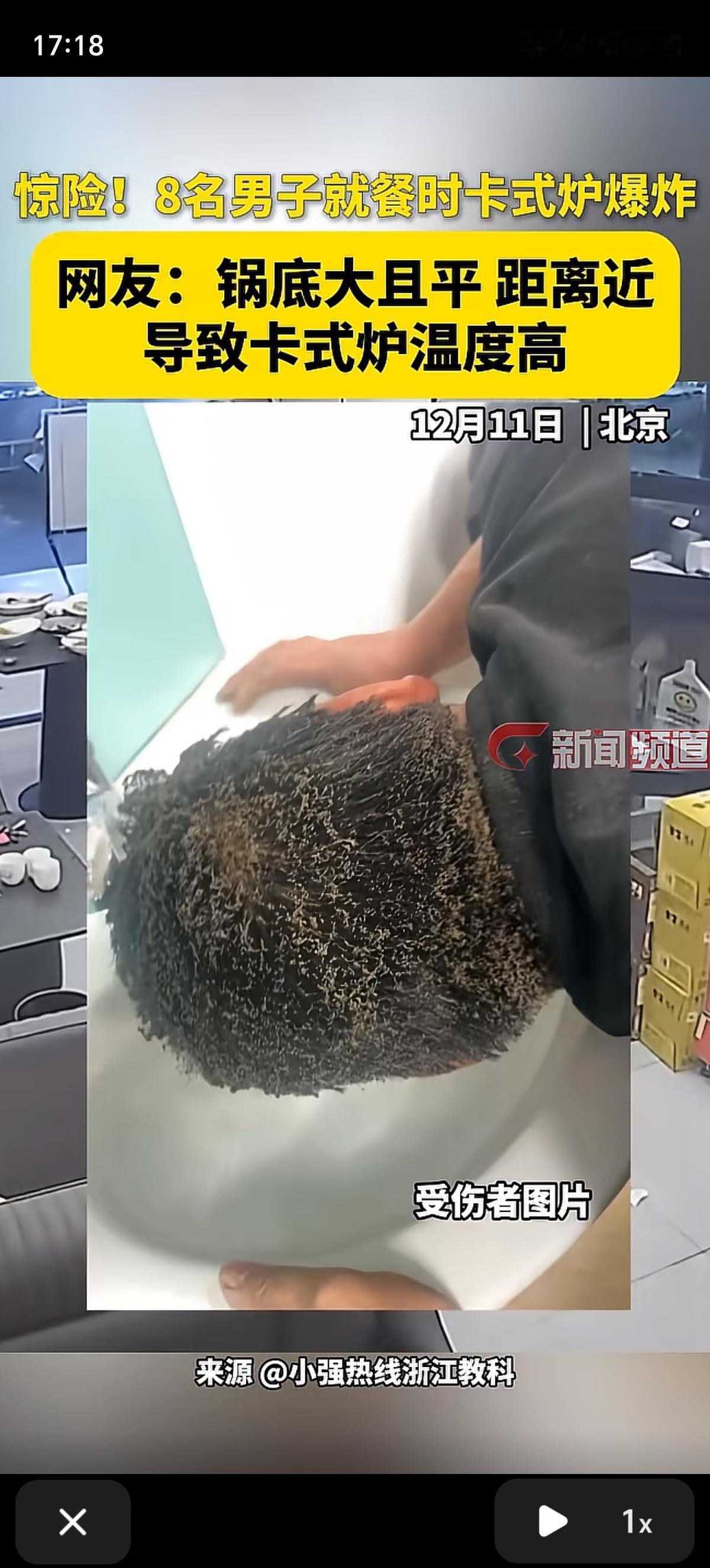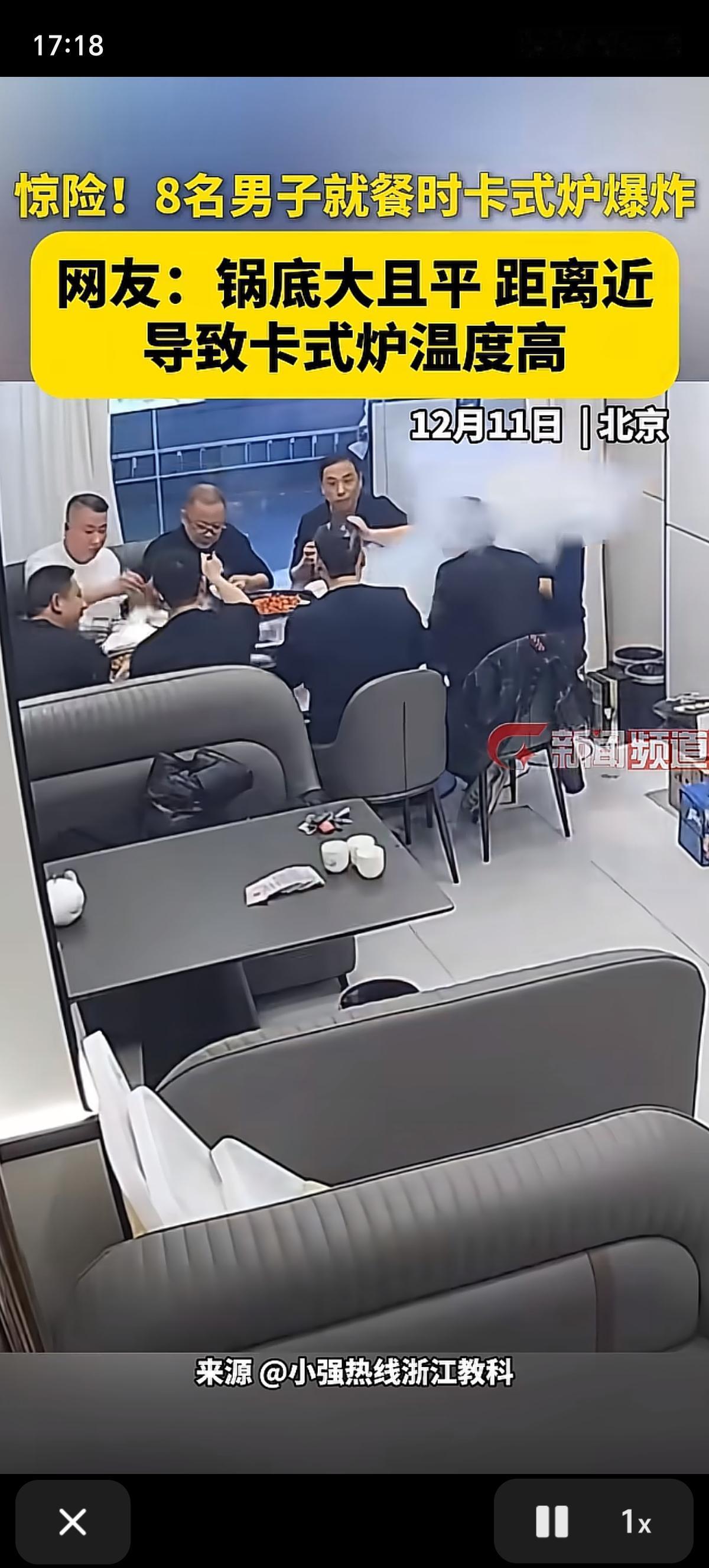 涮火锅差点把自己烤熟了的还是头一回见。北京的这8个人在饭店聚餐,吃的好好的,炉子就爆炸了,这卡式炉风险不小,一个用不好直接火锅炖自己。 把哥几个吓的,有的端着盘子、拿着碗筷就跑了,幸好伤情不是很严重。看这头发都给烤焦了,直接跑洗手池用冷水冲去了。 这种卡式炉爆炸多半是用得不当造成的。最常见的就是“炉小锅大”,锅具尺寸太大,会把气瓶的位置也盖住,火焰的热量就会顺着锅体传到气瓶上,温度一高,气瓶里的压力骤增,可不就容易炸嘛。另外,气瓶没安装到位、接口没拧紧,或者气罐本身有破损、过期,也可能引发危险。 其实不止这一起,之前不管是户外露营还是别的餐厅,都发生过类似的卡式炉爆炸事故,有的还伤了人。所以不管是店家还是咱们自己用,真得注意:选锅具得跟炉体匹配,别用太大的;装气罐的时候一定要卡紧,听到“咔嗒”的锁定声才靠谱,千万别倾斜或倒置;用之前也得检查下气罐有没有破损、漏不漏气,通风不好的地方也别用。安全这事儿真不能马虎,毕竟吃饭是图开心,可不能被“饭桌炸弹”扫了兴!