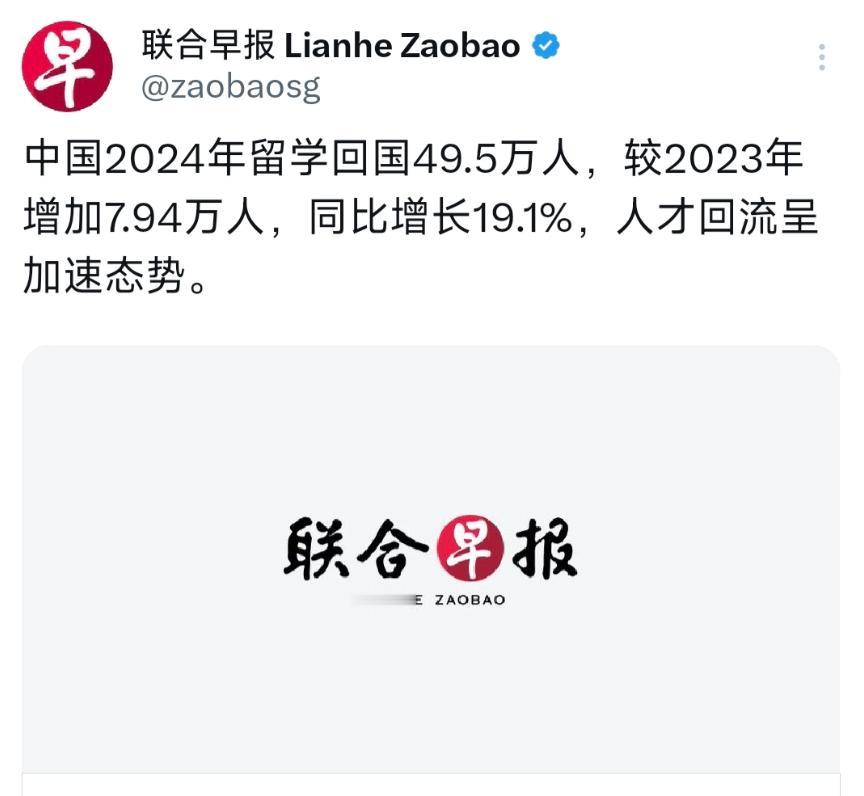 12月11日,新加坡联合早报发表:“中国2024年留学回国49.5万人,较2023年增加7.94万人,同比增长19.1%,人才回流呈加速态势。” 说白了,这是因为国际发展趋势正在慢慢往中国的方向靠拢,美西方国家现在一边想找中国合作,一边想遏制中国发展,这种自相矛盾的姿态,就是最好的证明。 要知道,美国发展策略是比较单一的,并且近年在科技、产业等领域愈发明显,而中国是在走全面发展路线,并且在科技和产业一部分领域已经反超美国,既然在国内也有更好的选择,那就完全没有必要留在美国了。相反留在国内,既能实现个人价值,还能多陪陪家人,一举多得,何乐而不为? 其次,美国签证与绿卡政策正在全面收紧,从制度上关上了不少人留在美国的大门,使其也不得不回国发展。 说到底,这场人才回潮,不仅是个人的选择,更是全球发展趋势的结果,中国慢慢的在时代的变革中,早已悄然蜕变,从过去的“追赶者”成长为能承载越来越多人理想的“香饽饽”。