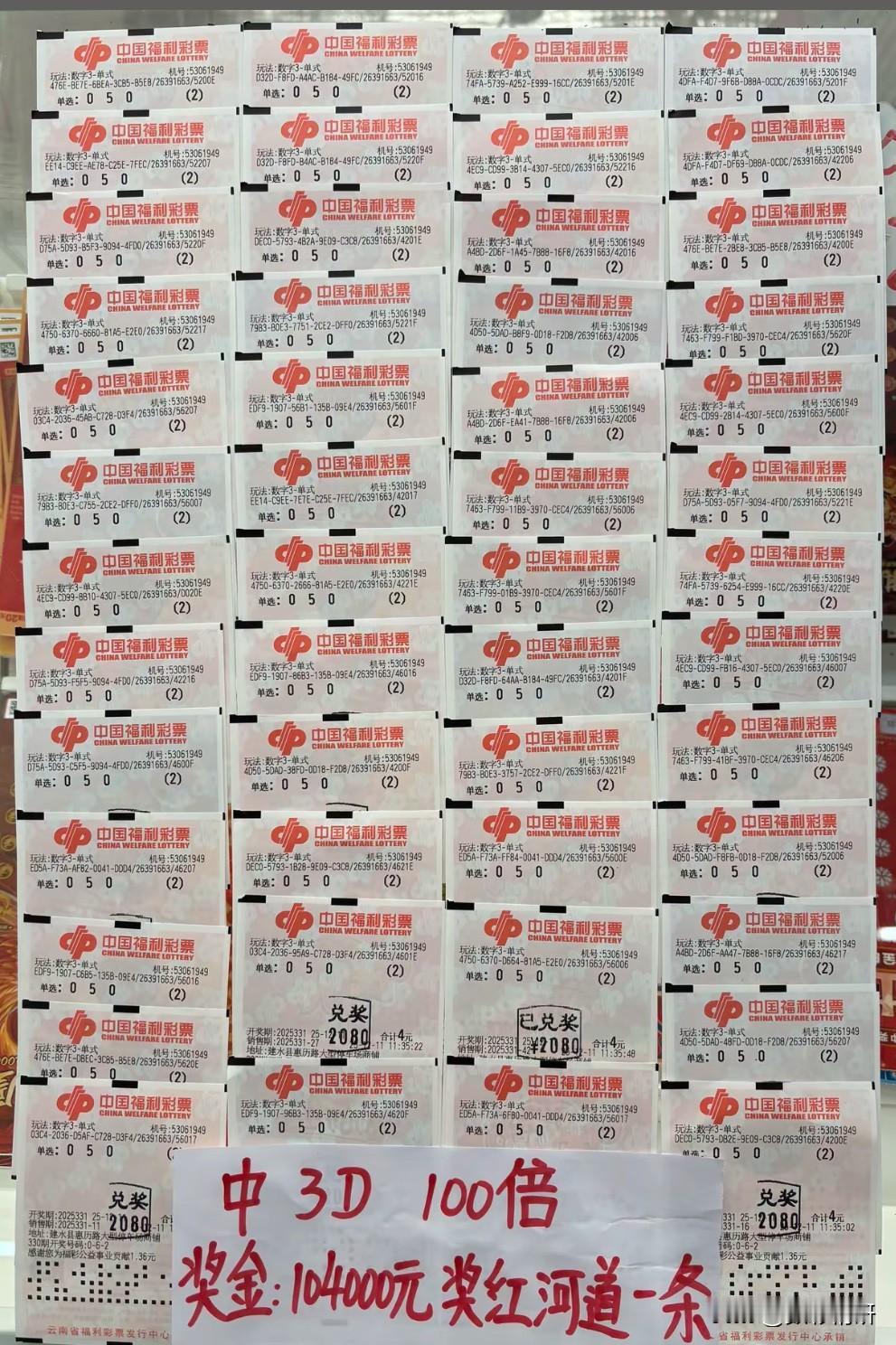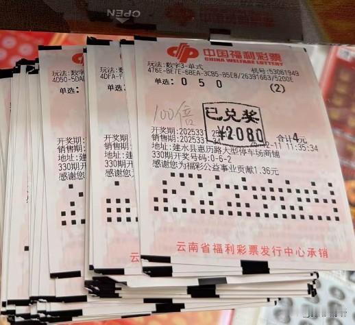 喜中10.4万元还无需缴税!11晚福彩3D中,开奖号码为“050”,有彩票店主晒出彩民中得100倍的喜讯——每张彩票投注2倍,共计打出50张,每张中奖2080。由于单张奖金未超过3000,无需登记个人信息,可直接在投注站兑奖,并且同样享受免税待遇。这当中是否存在规则上的漏洞呢?欢迎大家畅所欲言,谈谈你的看法。