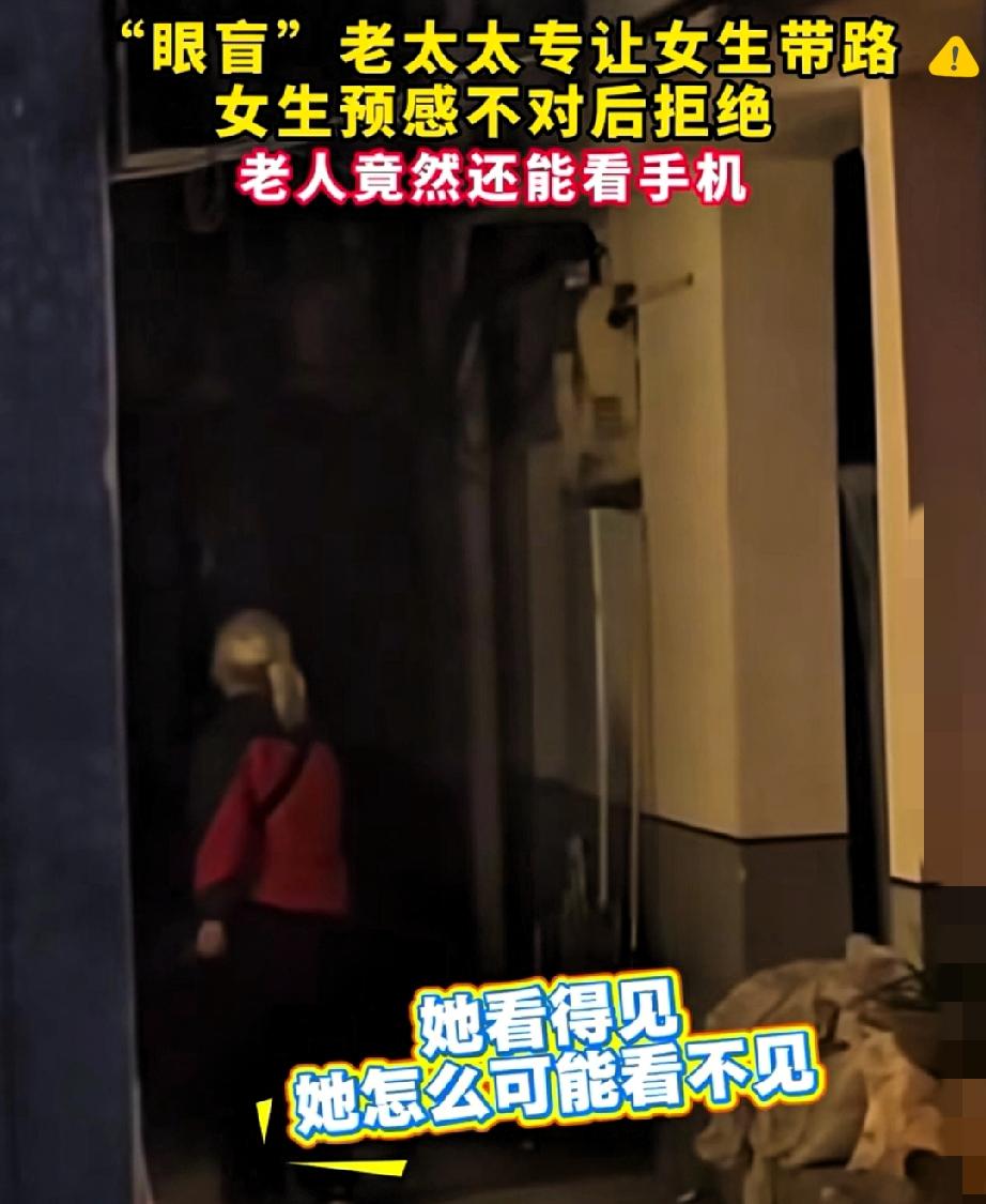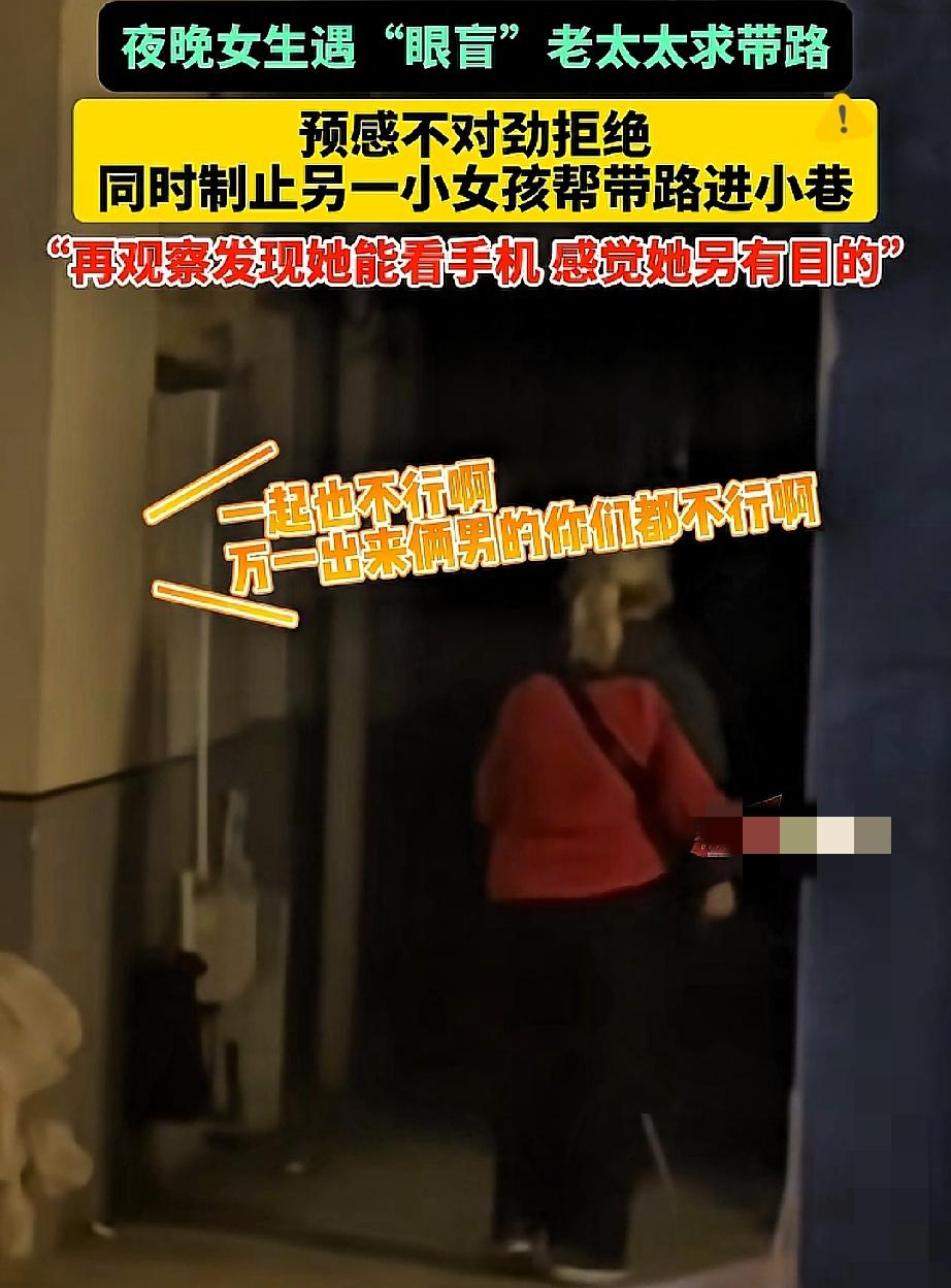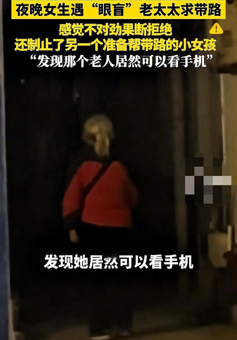 长沙女生这波操作真的太绝了! 夜晚遇到自称“眼盲”的老太太专挑女性带路,直觉不对劲果断拒绝,还顺手救下要进小巷的小女孩,转头就撞见老太太熟练看手机——这哪是眼盲,分明是把善意当猎物! 别觉得“老人求助”就一定该心软,骗子最会利用“弱势群体”的滤镜钻空子。 夜间偏僻路段、只找特定人群求助、回避正规帮助渠道,这些都是藏在“可怜”背后的危险信号。 善良从来不是傻气,真正的善意该带点锋芒。 不是不让帮人,而是帮之前先过过脑子:对方的需求合不合常理?有没有更安全的求助方式? 那些滥用善意的骗局,毁的不只是一次信任,更是让真正需要帮助的老人小孩陷入“求助无门”的困境。 你遇到过这种可疑的“求助”吗?如果是你会怎么应对?