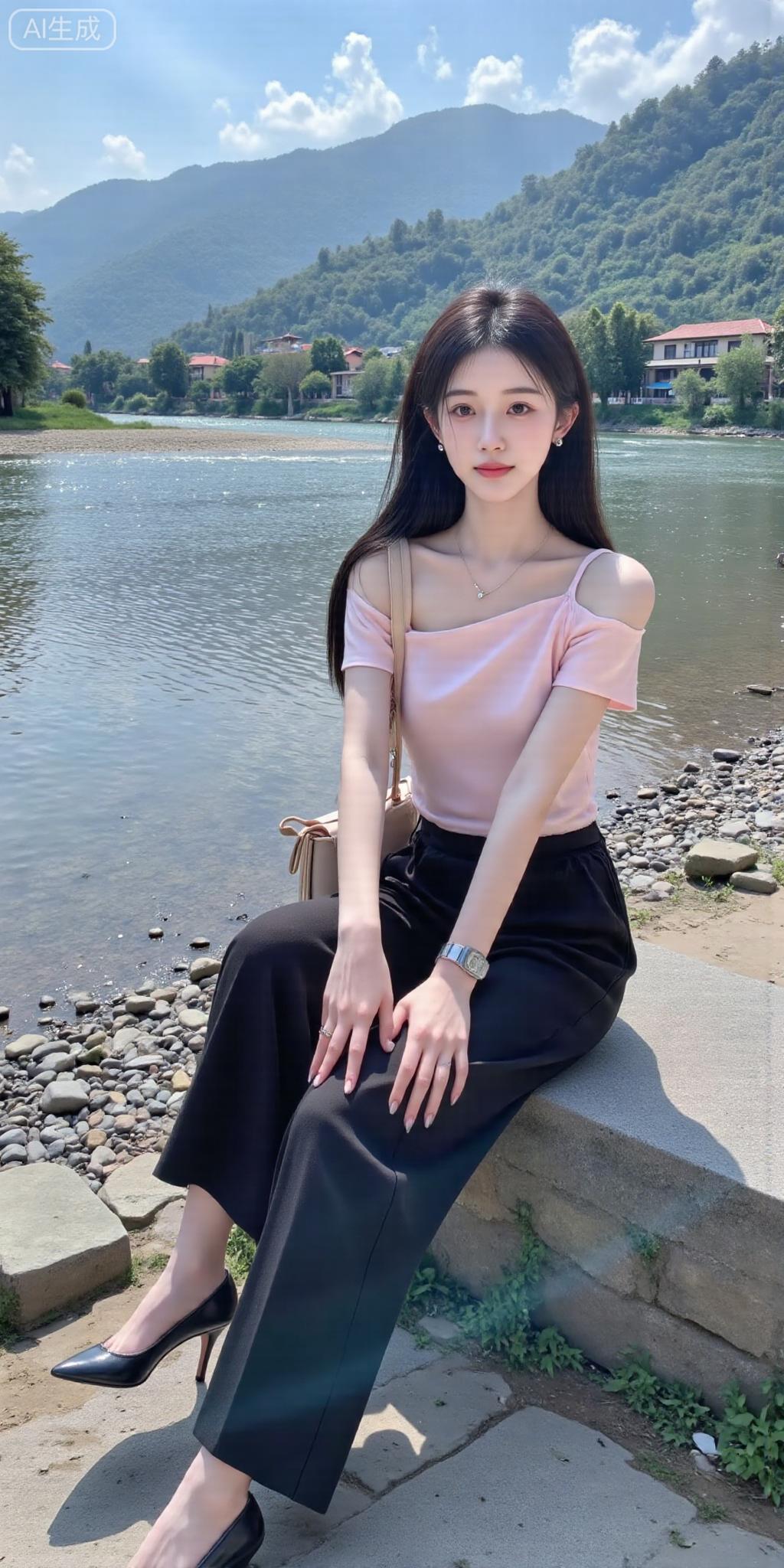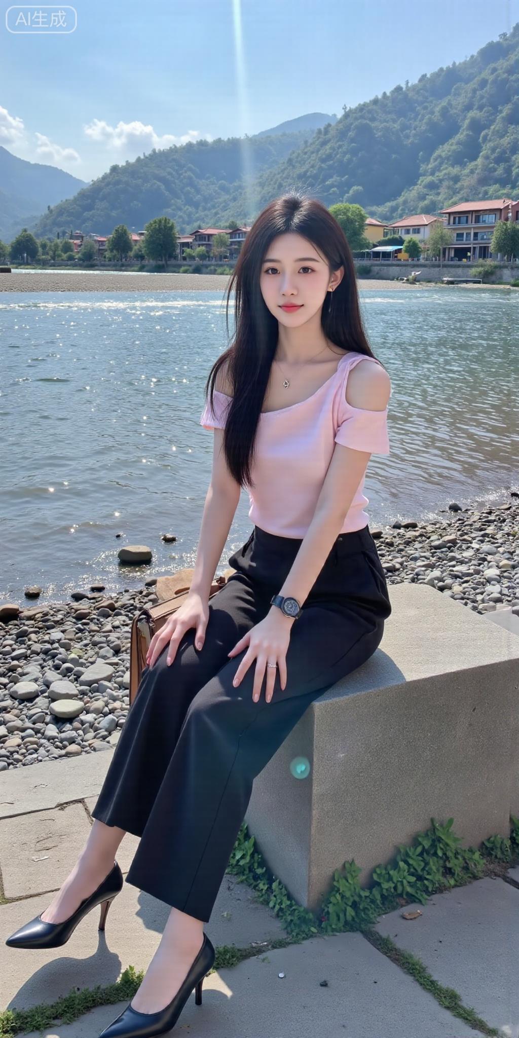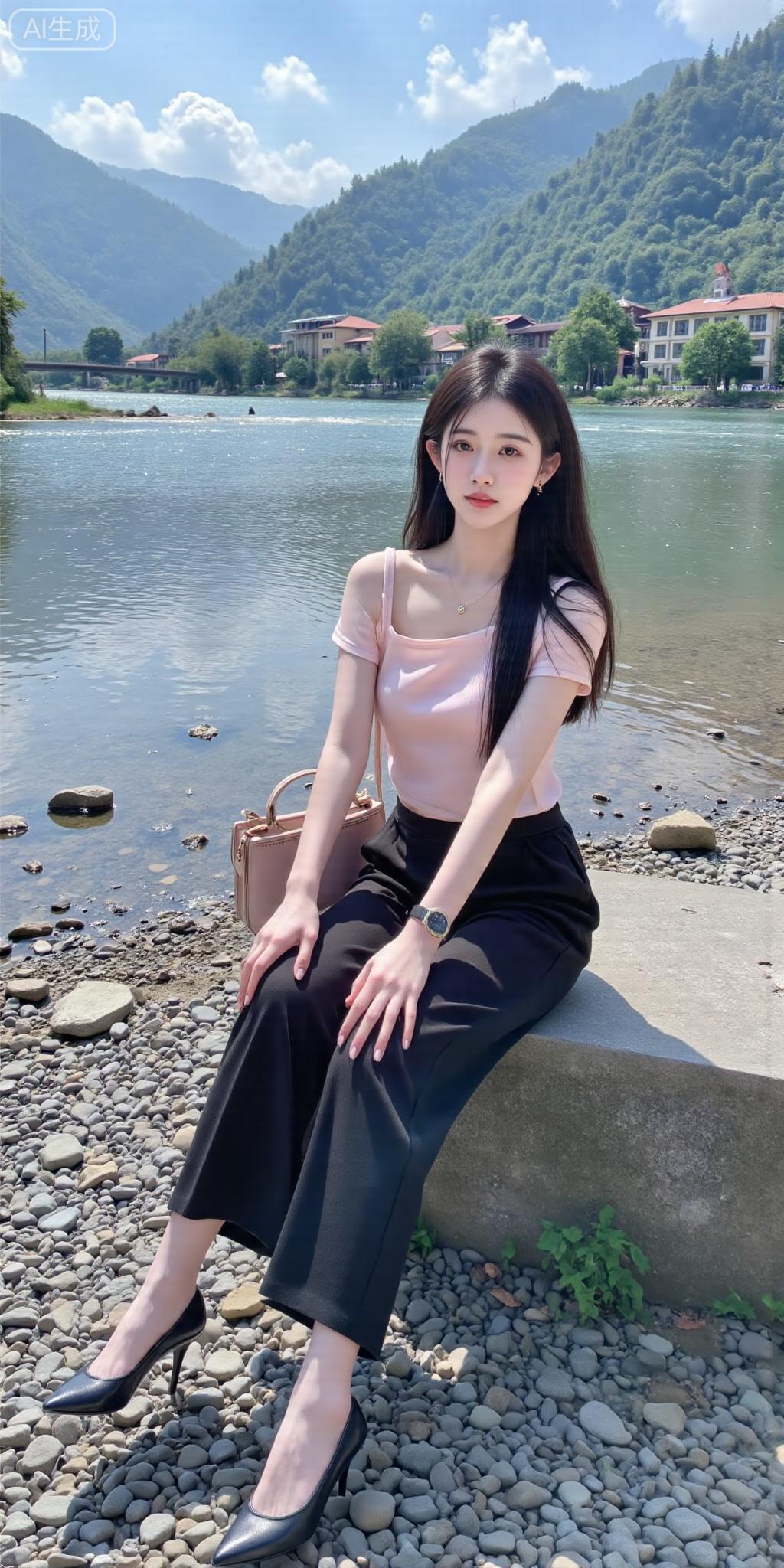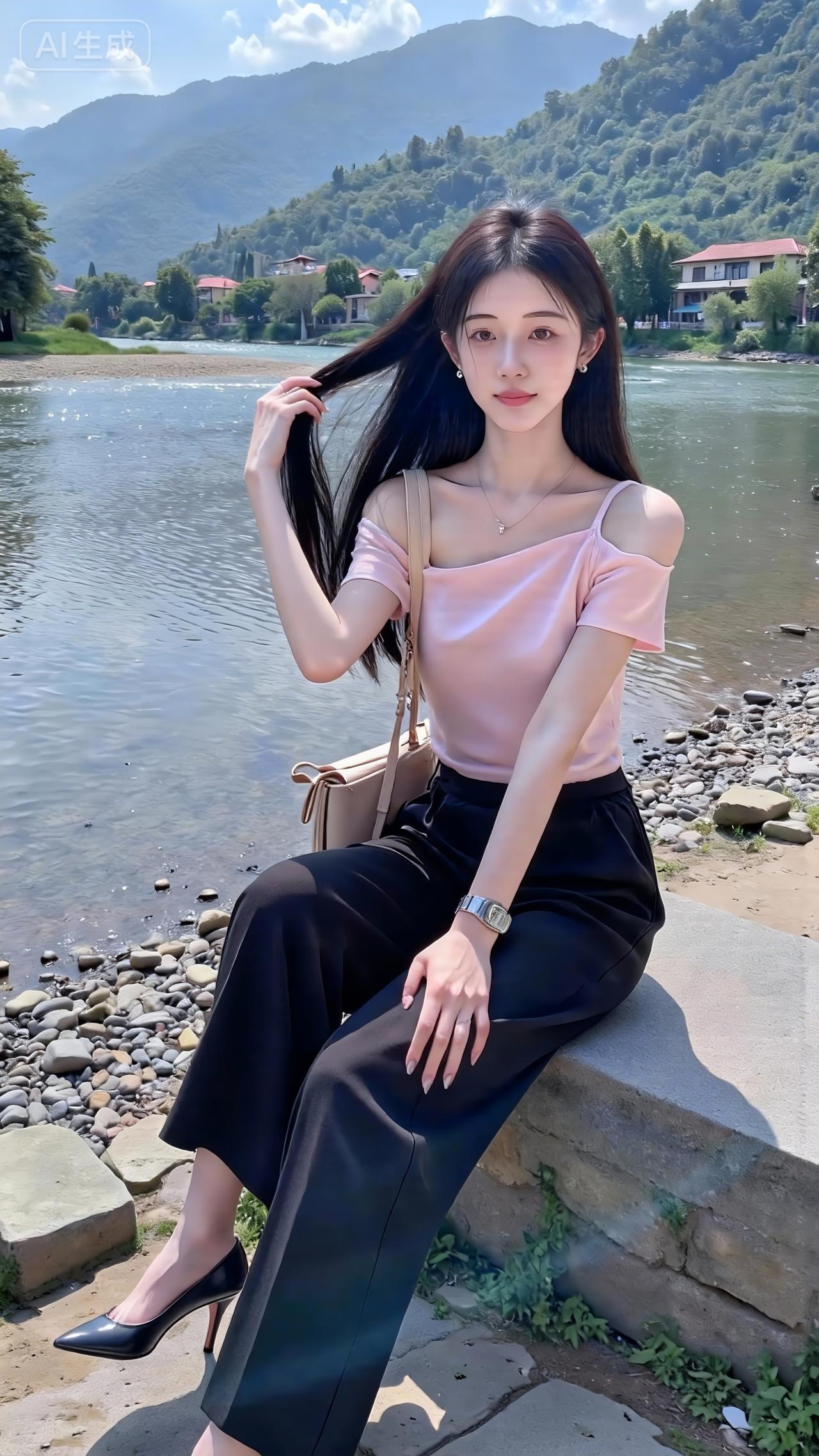 河畔风裹着青山色,粉衫配黑裤衬出舒展的柔,她往石上一坐,连水波都跟着慢了下来。