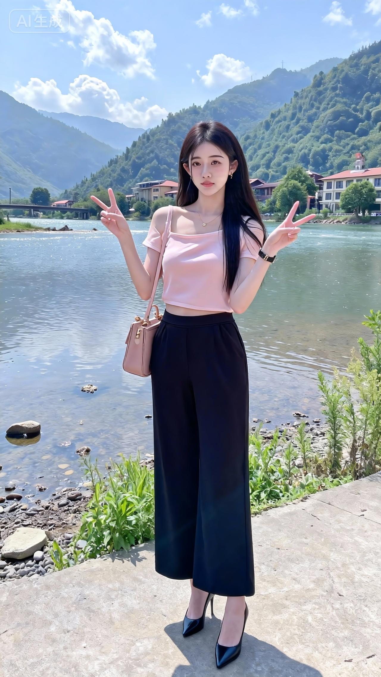 河畔风裹着青山色,粉衫配黑裤衬出舒展的柔,她往石上一坐,连水波都跟着慢了下来。 度假穿搭 松弛感美人休闲风黑裙