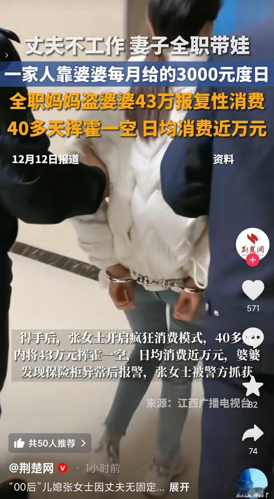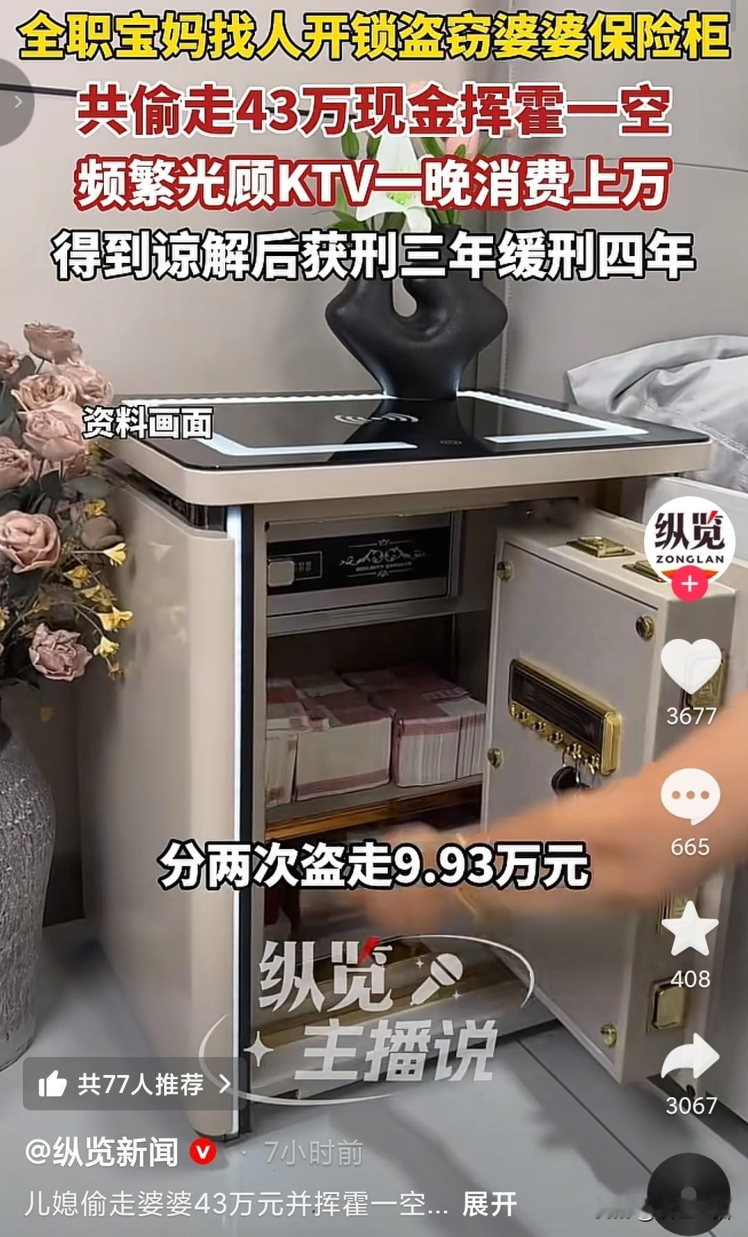 “日防夜防,家贼难防”, 儿媳妇盗取婆婆43万现金,40多天挥霍一空。 她要是把钱用到孩子身上和出去旅游还好解释,但她一拿到钱就是去KTV,婆婆原谅你了,你老公都不一定会原谅你。 老公长期没有工作,没有做到养家的责任,妻子(张女士)则在家做全职妈妈,全靠婆婆每个月接济3000块钱生活。 今年3月,彩礼就已经全部花光了,就盯上了婆婆的保险柜,想要花钱了就以钥匙丢失,请人上门开锁,分两次盗走9.93万元,为了掩盖痕迹,还更换锁芯,累计一共盗取43万。 拿到钱之后就报复消费,一天花一万,盗窃数额巨大,已经触碰到了法律,好在婆婆也知道自己儿子没工作,孙子还小,说不定将来还考公,总不能毁了孙子的前途,给出了谅解书,最后判3缓4。 这婆婆也够倒霉的,儿子没工作,一家子人全靠她养活,儿媳妇还把她钱给偷了,说到底就是喜欢玩,把彩礼花完之后,拿到婆婆的钱就频繁进出KTV,她要是拿钱狂吃狂喝去旅游,老公还能理解,毕竟带娃太压抑了,而她一周要去四五次KTV,一晚消费上万元,现在这种情况,她又怎么跟老公解释? 婆婆能够留她,完全是看在自己孙子的面子上,彩礼花完了,要钱也是问自己的丈夫,他如果不去工作的话,就催促他去工作,40多天花完43万自己的亲妈都不一定受得了。