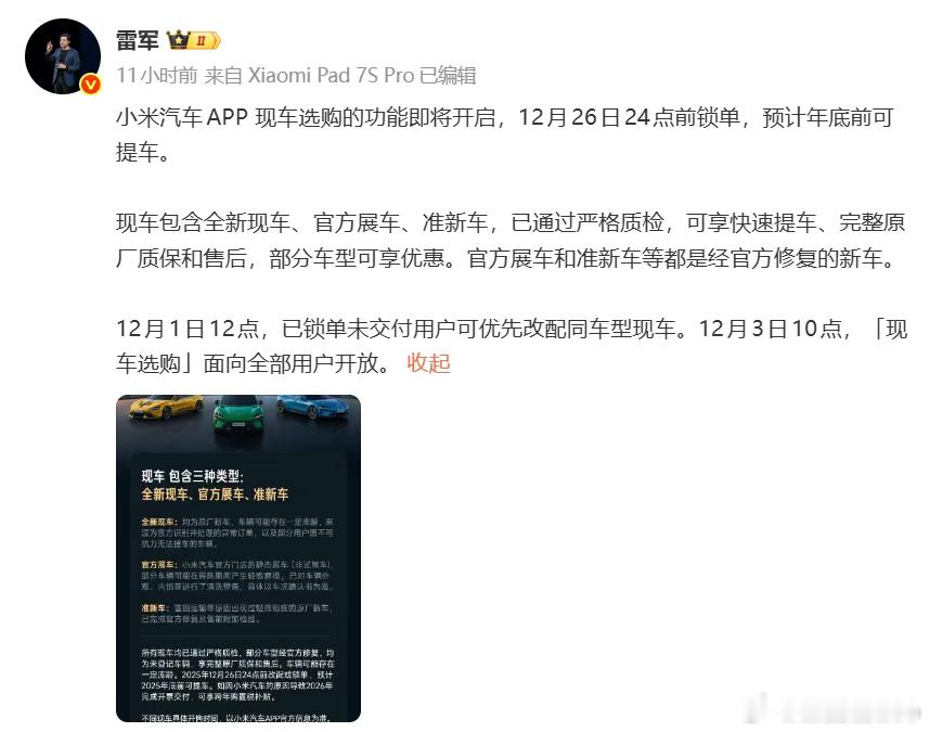 12月12日上午,小米集团创始人雷军在其微博账号转发该条信息并回应小米准新车开售,称准新车就是因运输等原因产生维修项的原厂新车,这些车经过官方修复及附加检验。12月12日上午,小米汽车微博官方账号发布消息称,今早11点,小米汽车“现车选购”新增准新车上架开售。消费者可在小米汽车APP选购。现车包含全新现车、官方展车、准新车,已通过严格质检,可享快速提车、完整原厂质保和售后,部分车型可享优惠。面向所有用户开放,已锁单未交付的用户可改配。消费者可在小米汽车APP选购。必须说的是,行业中还没有将运损车、库存车等作为“新车”在官方APP售卖的先例,基本都是内部处理。此前某车企因为通过经销商处理了一批4S店的展车,还被认为是零公里二手车,所以这种操作是车企们尽力避免的。对“新车”应该有自己明确的定义,还是不要搞一些新词语出来。雷军回应小米上架准新车争议全网热点共创计划