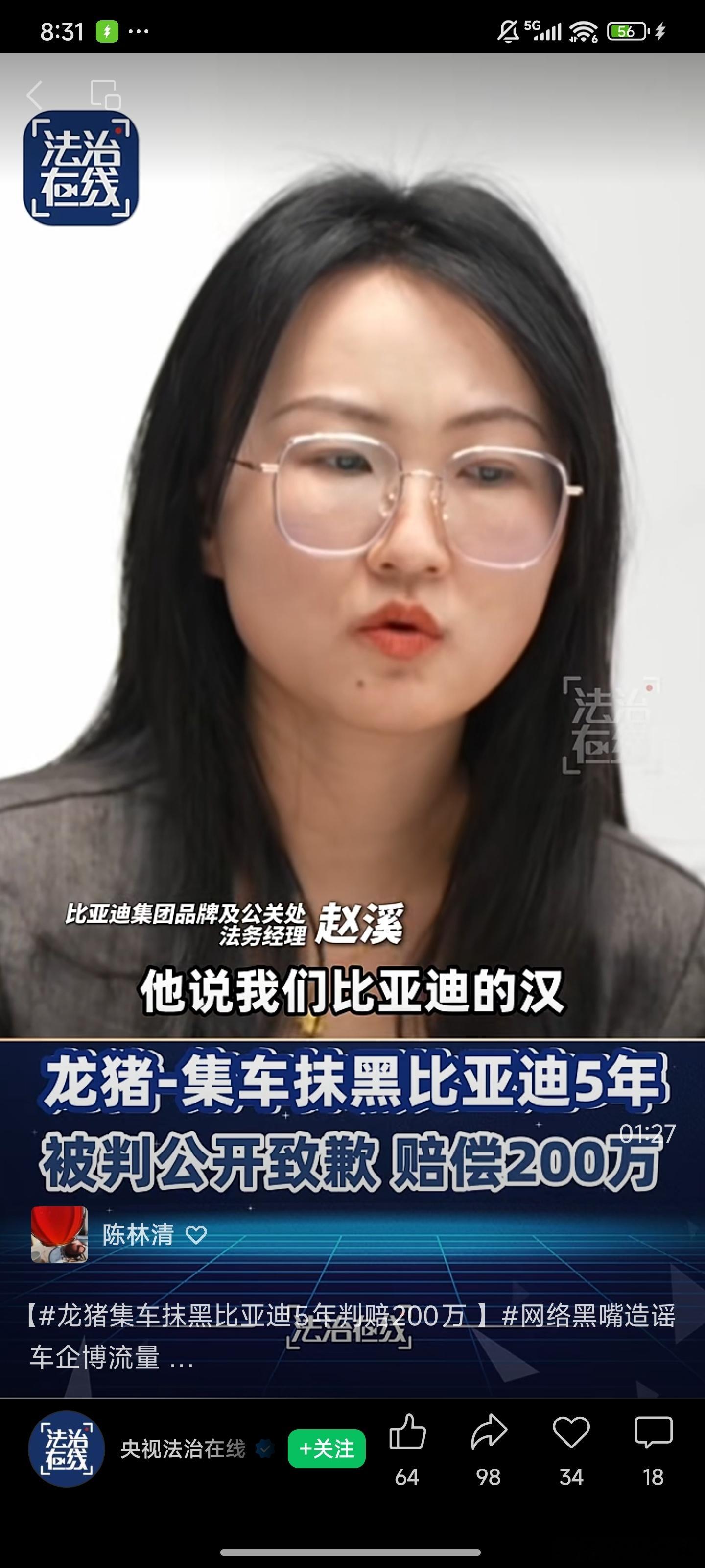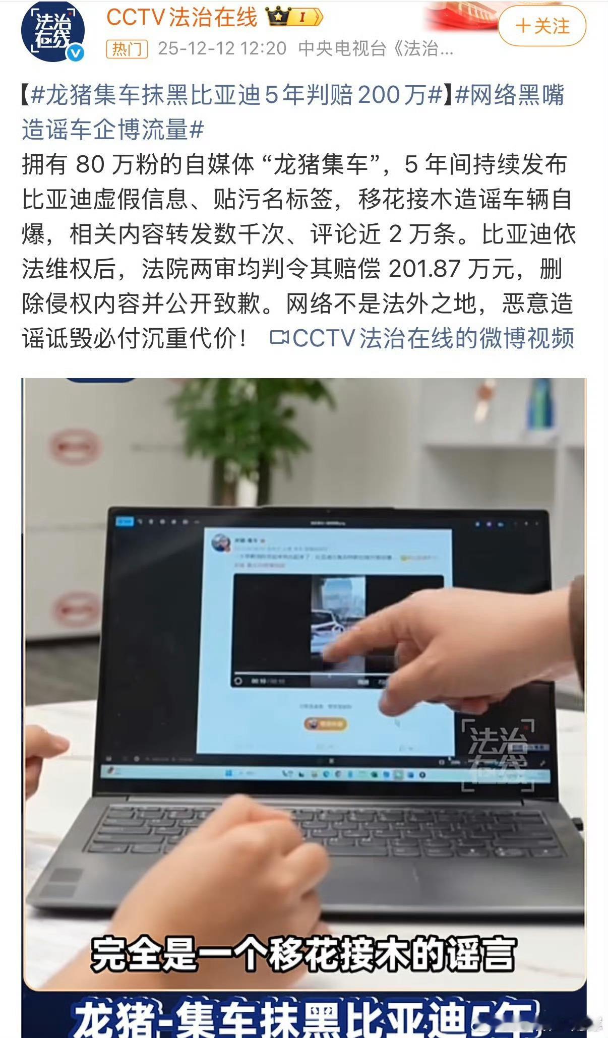 自媒体博主“龙猪集车”真的带了一个不好头,黑流量持续吃了五六年,给后面这些黑比亚迪的博主找到了流量密码,必须安排全套封号套餐……现在还是有很多打着擦边球在那贬低比亚迪的,也是真的恶心,而且流量也不小,这类人希望也有办法治一治像龙猪在五年间持续发布针对比亚迪的侮辱、诋毁内容,甚至用“移花接木”的起火视频造谣“车辆自爆”。法院二审认定其构成名誉侵权,判令其删除内容、公开致歉,并赔偿比亚迪经济损失201.87万元,只算是一个开始吧,希望有更多黑流量博主得到法律的援助