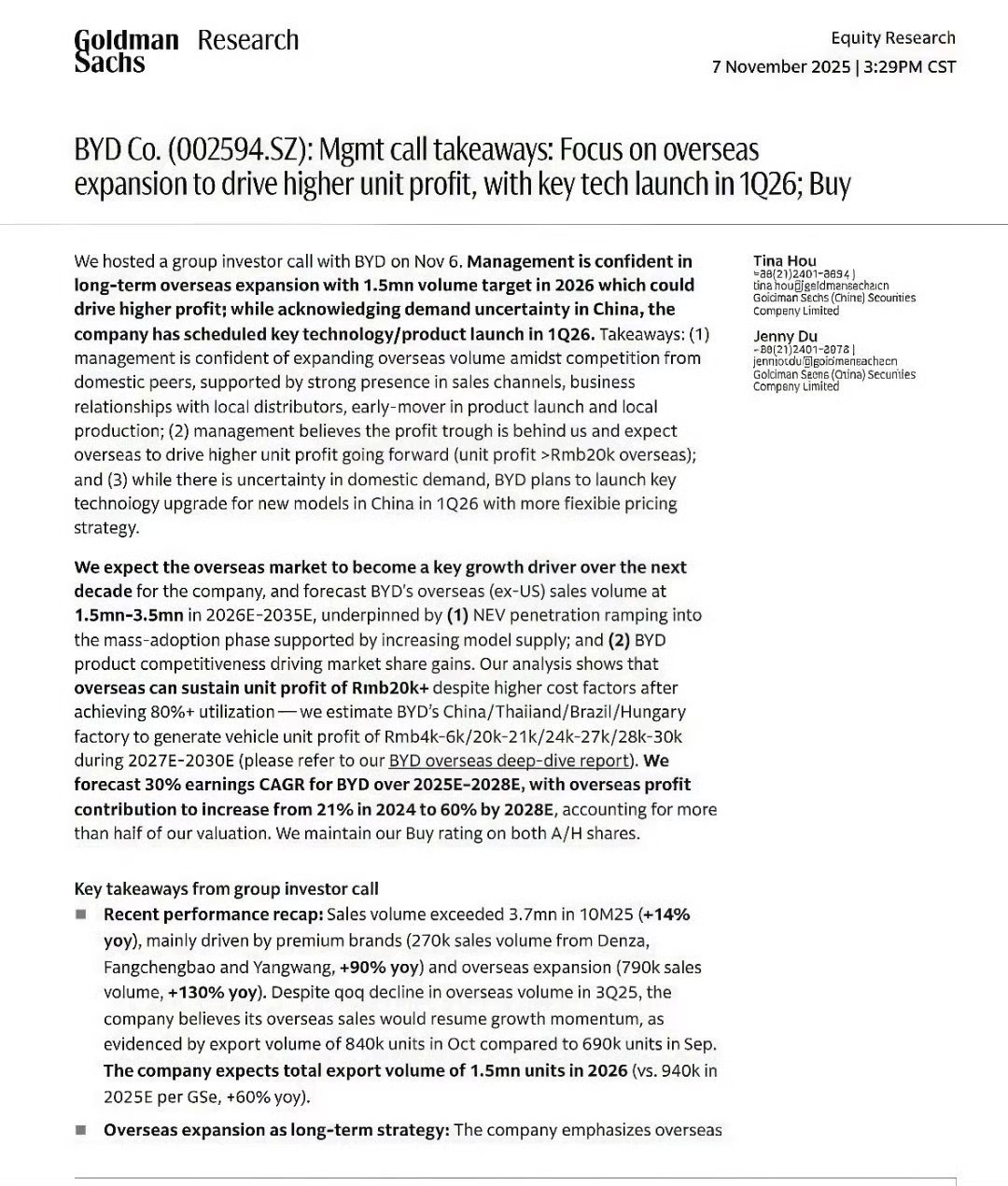 【纷纷调高评级,比亚迪成为国际资本眼中的“香饽饽”】 近半年来,中国汽车市场竞争加剧,汽车板块股价整体表现弱于大盘,市场悲观情绪蔓延。 虽然行业处于调整周期,但比亚迪却成为资本眼中的“香饽饽”,进入四季度以来,高盛、花旗、摩根士丹利等国际顶尖投行密集发布深度研报,纷纷给予比亚迪“买入”或“增持”评级, 市场发展预期一片向好,彰显资本市场看好比亚迪未来长期发展的信心。 高盛在11月7日的研报中明确指出:海外市场将成为比亚迪未来十年的核心增长领域, 依托完善的车型矩阵与强大的产品力,比亚迪2025年至2028年盈利年均复合增长率将达30%, 海外利润贡献度将从2024年的21%升至2028年的60%,2026至2035年海外销量有望达150万至350万辆,为此高盛坚定维持其A股、H股“买入”评级,A股目标价144元人民币,相较于12月9日收盘价仍有约50%上涨空间,花旗与摩根士丹利两大国际投行也对比亚迪表达出相似的乐观预期。花旗11月已将比亚迪纳入90日正面催化观察名单,花旗相信随着明年一季度国内新车型周期到来,加上行业连续去库存积极效应,比亚迪可能为他们带来更高的业绩回报。基于此,花旗将比亚迪继续列为“行业首选”,更坚定维持其“买入”评级,H股目标价174港元,相较于12月9日收盘价溢价约77%。而摩根士丹利10月研报则预测,2026年比亚迪海外销量将达到160万至180 万辆区间,年增长率可达68%至89%,同步给出“增持”评级与H股130港元目标价,上涨空间约33%。 2025年1-11月,比亚迪整体销量保持稳健增长,更在高端化与全球化两大战略上给出亮眼成绩单,仰望、腾势、方程豹三大高端子品牌形成矩阵,全面覆盖不同细分高端市场,其中腾势品牌累计销售13.9万台,同比增长25%,方程豹品牌累计销售近18.4万台,同比增长309%。同时, 出海增速超预期,1-11月海外销量超91万辆,已超过去年全年的两倍,今年海外销量有望突破百万大关。从自建8艘滚装船船队保障物流需求、海外多地建厂投产,业绩与战略的双重突破,根源在于比亚迪的全产业链布局与通过持续的技术创新构建的深厚护城河。在贸易保护主义盛行的背景下,自主可控的完整产业链保障了供应链安全与交付稳定性,不仅实现整车制造优势,更在核心零部件领域具备行业赋能能力,进一步拓宽盈利空间, 增强抗风险能力。 LPB 自主构建电动汽车100V全产业链制造能力兆瓦闪充油电同速技术创新是比亚迪持续引领新能源汽车行业发展的法宝。从刀片电池重新定义新能源汽车安全标准,到DM-i超级混动颠覆传统燃油车市场,再到易三方、兆瓦闪充等技术引领行业发展方向,比亚迪始终以技术创新驱动行业发展,推动行业技术迭代升级。