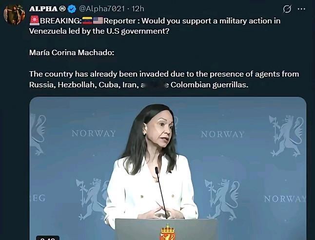 跳梁小丑!马查多在美国主子的保护下离开自己的祖国委内瑞拉,跑到了挪威奥斯陆,她这是奔着和平奖去的! 一个靠出卖自己的国家上位,一个支持内塔尼亚胡“坚决进攻加沙”的政治流氓,却获得了和平奖,可笑至极。现在马查多之于美国还有利用价值,等到哪一天没有了利用价值,她会像扔一只臭袜子一样被无情扔掉,想想一个可以出卖自己国家的人,怎么会被信任。