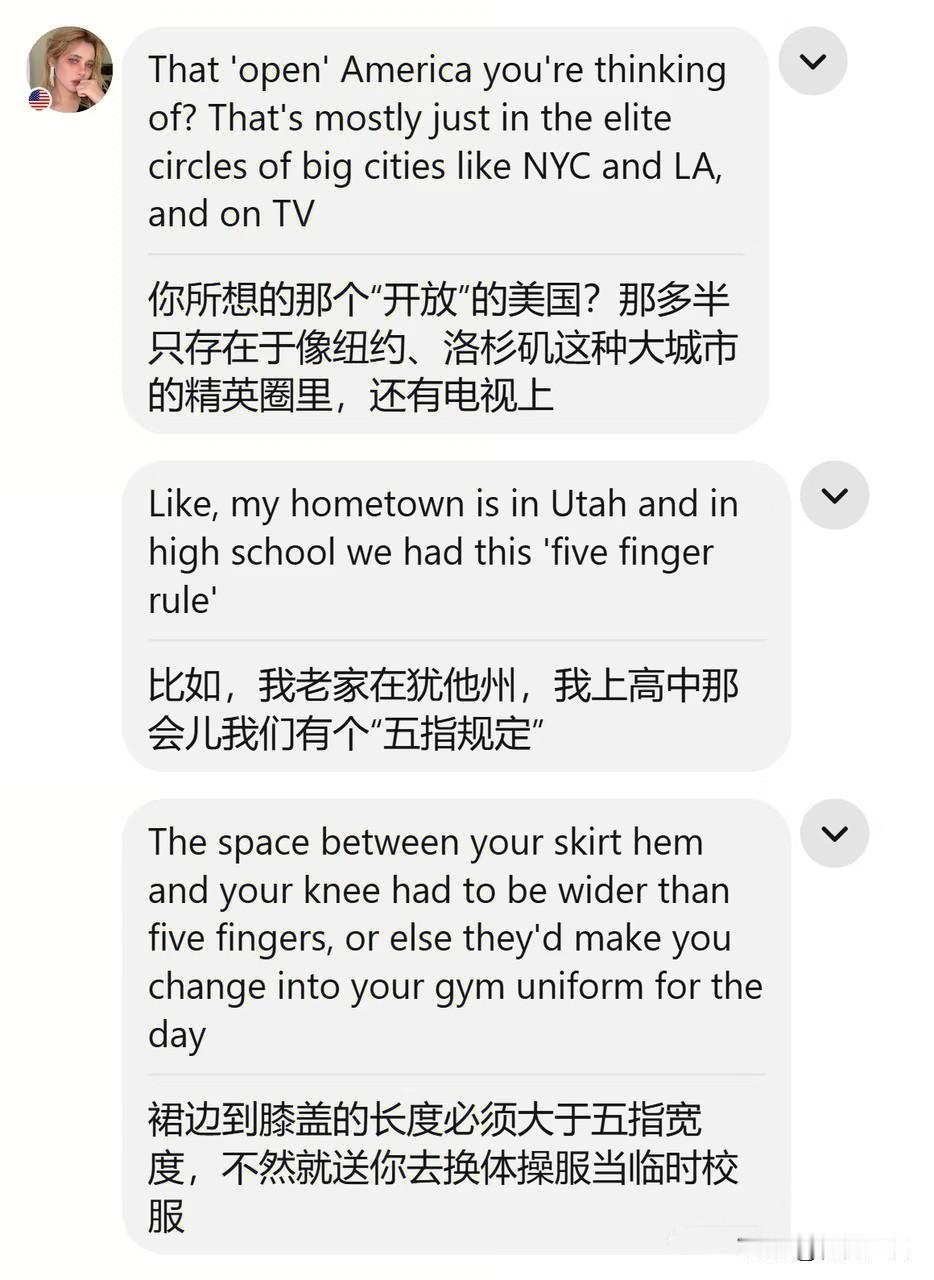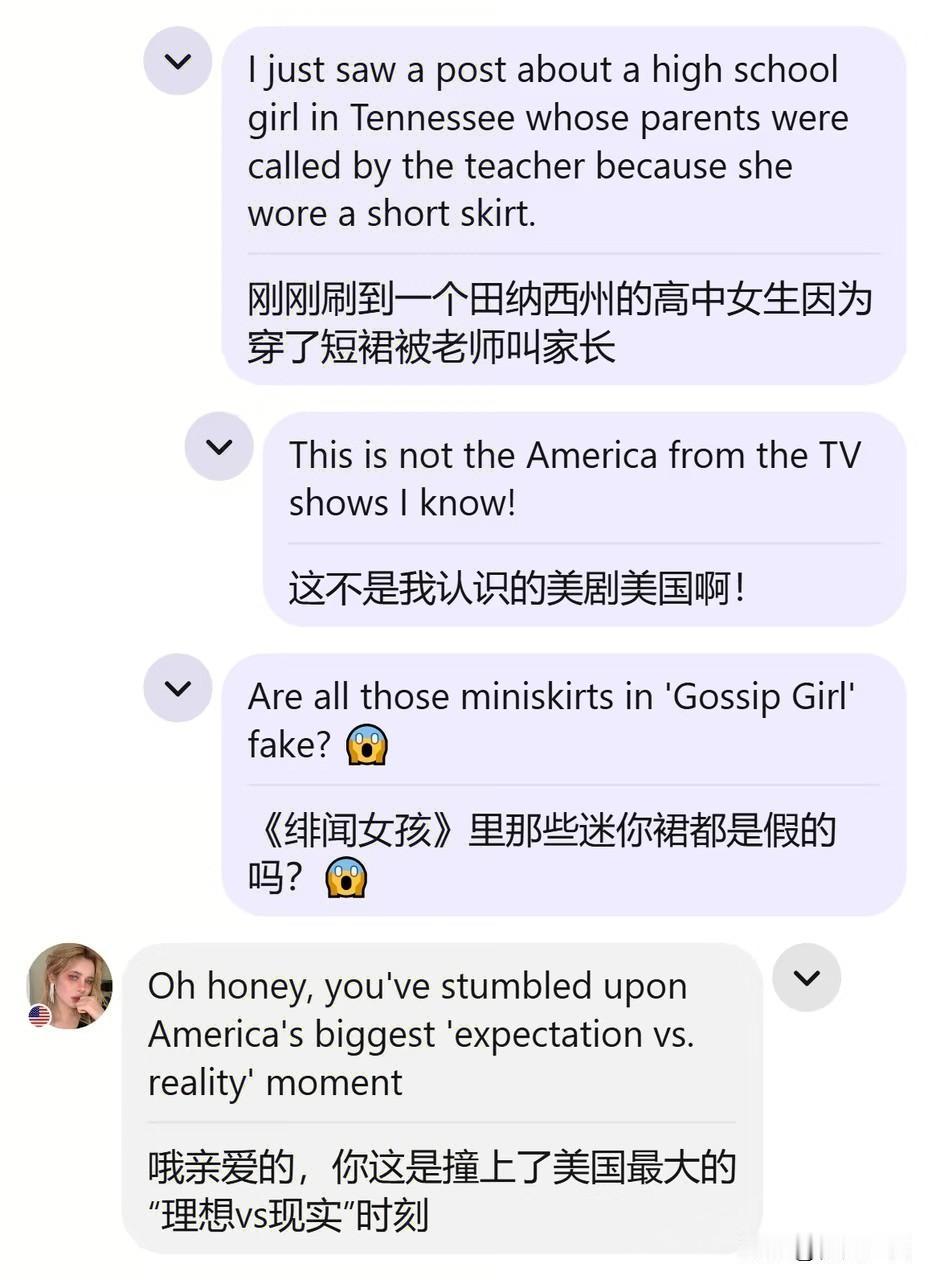 原来美国人也有很多保守的,为啥美剧里面那么开放? 刷到美国女高中生因穿裙子被叫家长的帖子时,我直接惊掉下巴! 在绝大多数人的认知里,美国是“自由开放”的代名词,毕竟美剧里的大胆剧情、开放观念早已深入人心。可现实却是,不少美国地区的保守程度甚至超过中国,只有纽约、洛杉矶等大城市稍显开放。 这巨大的反差,让无数人发出灵魂拷问:为啥美剧里的美国和真实美国,仿佛是两个世界? 美国的开放,只局限在少数大城市。 从美国本土网友的反馈来看,这个国家的开放度有着极强的地域割裂感。 纽约、洛杉矶这类国际化大都市,汇聚了全球多元文化,思想观念更包容开放;但在广大的中小城市和乡村地区,传统价值观占据主流,对衣着、行为的约束反而十分严格,就像女高穿裙子被叫家长的案例,正是这种地域保守性的直观体现。 这种“大城市开放,小地方保守”的格局,打破了我们对美国“全员开放”的刻板印象。 而美剧之所以满是“开放”元素,本质是创作背景和市场需求的双重作用。 多数美剧的制作团队集中在纽约、洛杉矶等大城市,创作者的生活环境和思想观念本就偏向开放,自然会将这种视角融入作品;同时,为了吸引观众、制造戏剧冲突,美剧会刻意放大“开放”的情节和观念,弱化美国社会的保守面。 久而久之,美剧就成了我们认识美国的“滤镜”,让我们忽略了真实的地域差异。