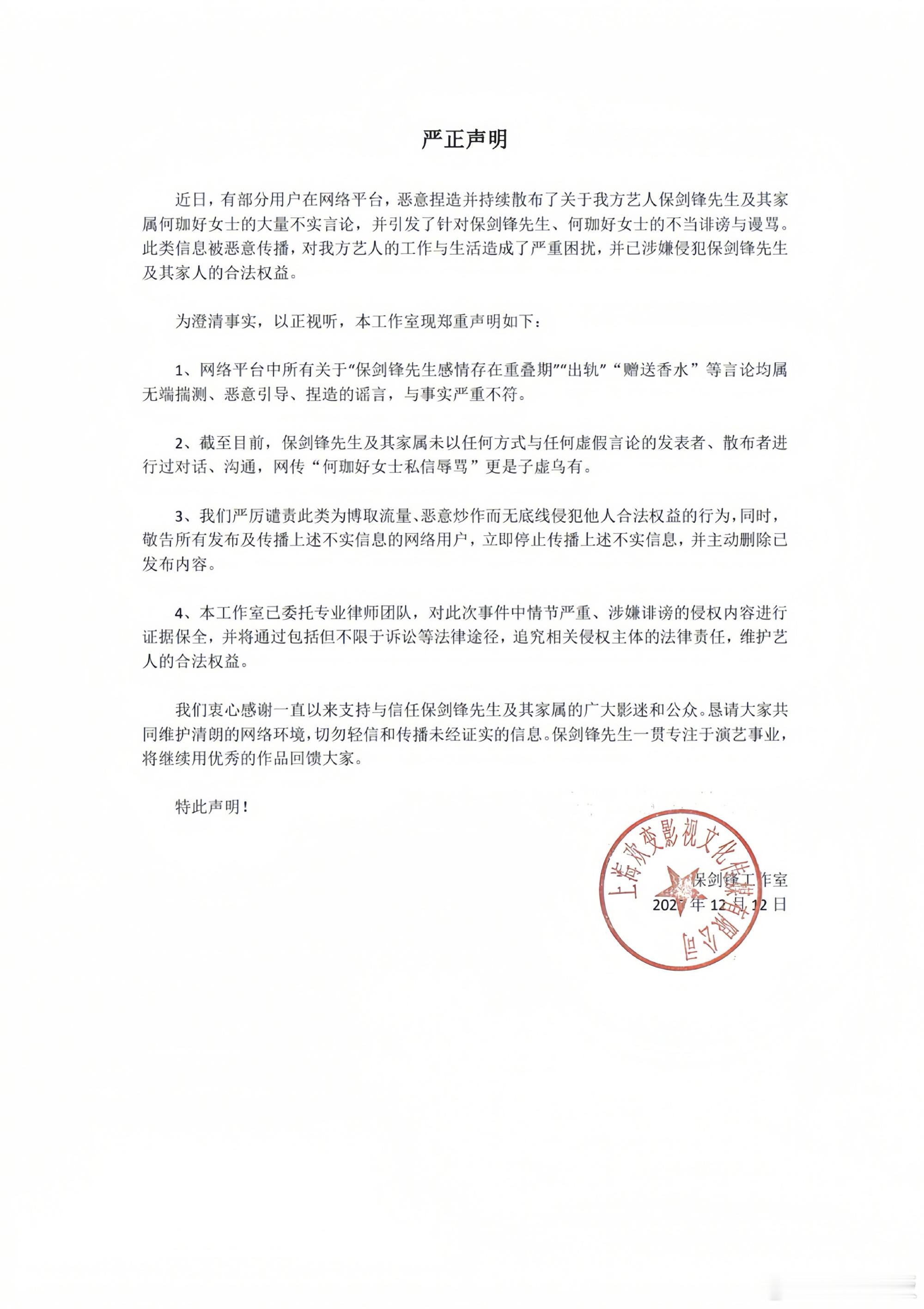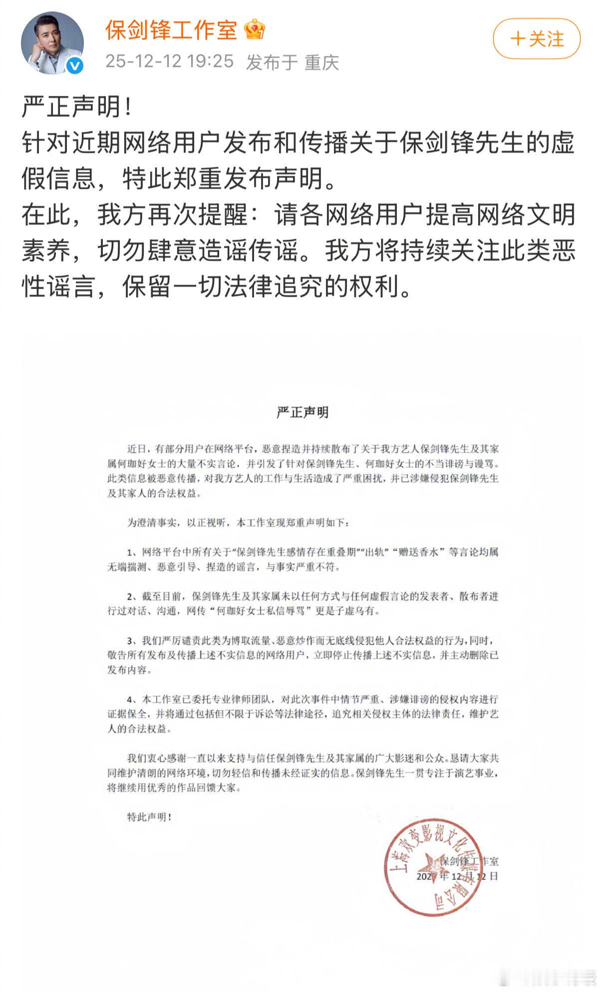 保剑锋工作室回应保剑锋工作室严正声明 发布严正声明,称所有关于“感情重叠期”“出轨”“赠送香水”等言论均为捏造,与事实不符。保剑锋及其家属从未与谣言发布者沟通,网传“何加好私信辱骂”也是虚假信息。呼吁大家切勿造谣传谣,并保留一切法律追究权利。