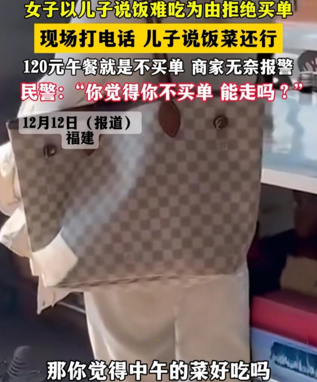 女子以儿子说饭菜难吃为由拒绝买单,现场给儿子打电话瞬间被打脸! 福建这位女子的操作真是让人开了眼!12月12日,福建一女子吃完120元的午餐后,居然以“儿子说饭菜难吃”为由拒绝买单,商家无奈之下只能报警。 民警赶到现场后,直接让女子当场给儿子打电话求证,结果电话那头儿子直言“饭菜还行”,瞬间戳穿了她的借口。民警当场反问:“你觉得你不买单,能走吗?”这话问得太解气了! 一顿120元的午餐,不算贵也不算便宜,女子却想出这种离谱理由耍赖,实在让人匪夷所思。商家开门做生意,食客消费买单是天经地义的事,就算真觉得饭菜有问题,也该和商家好好沟通,而不是用这种拙劣的借口逃避责任。 网友看到这事也纷纷吐槽,有人说“为了120元丢了人品,太不值了”,也有人觉得女子的行为又可笑又可气。最终女子在民警的劝说下,乖乖结了账,只是这下丢人可丢大了。 消费买单是基本的契约精神,耍小聪明耍赖皮,最后只会搬起石头砸自己的脚,大家可别学这种糊涂做法!饭店拒免费吃饭 饭店 吃饭 午餐