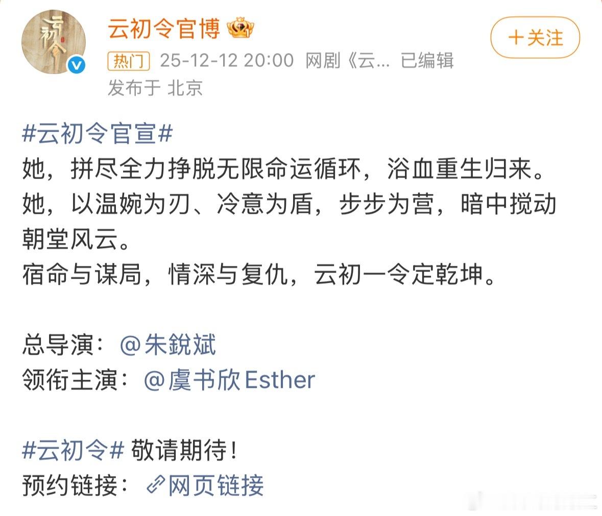 云初令官宣《云初令》单独官宣大女主虞书欣