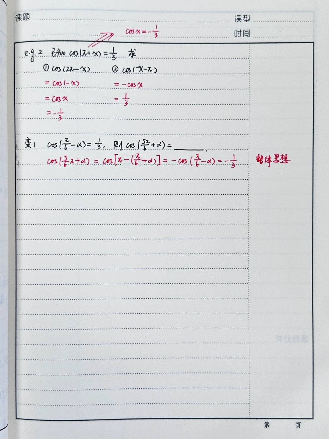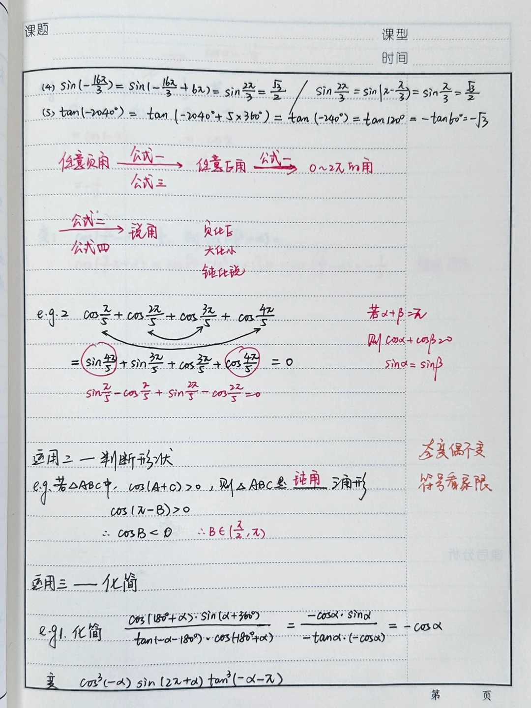 很喜欢用蓝色的笔,可是坏掉了…[哭惹R] 诱导公式的作用主要在于把任意角的三角函数化归成求“0⁰~90⁰”角的三角函数值问题。 能借助三角函数的定义及单位圆的对称性推导出诱导公式,会利用诱导公式进行简单的三角函数式的求值与化简,体会数形结合及转化思想的运用。