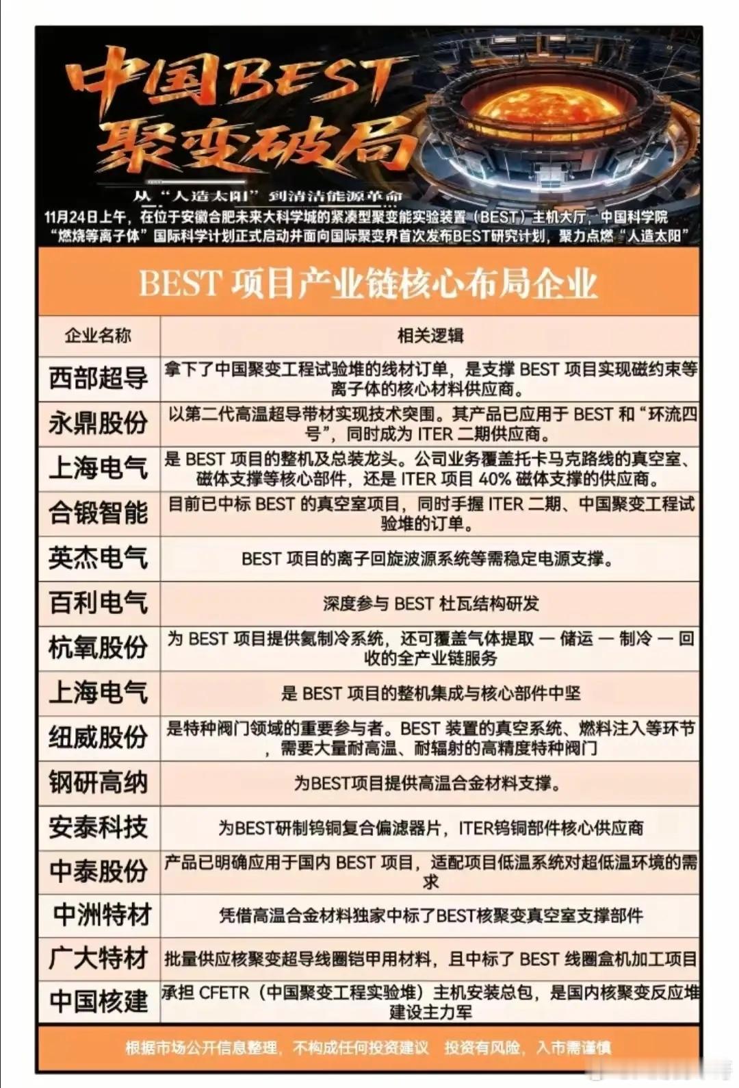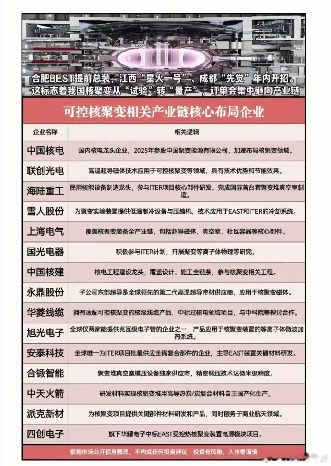 核电核能题材概念龙头梳理题材概念驱动事件:我国可控核聚变产业迎来关键突破!合肥BEST提前进入总装阶段,标志着我国核聚变正式从“试验”向“量产”迈进。题材概念投资逻辑:在全球“碳中和”背景下,它是唯一能同时满足规模性、稳定性与清洁性的能源选项。机构预测2030年全球核聚变市场规模接近5000亿美元。核电核能题材概念龙头代表有哪些?海陆重工:民用核能设备制造龙头中国核电:核电龙头参股中聚变安泰科技:全球唯一为ITER项目供应全钨复合部件的企业。中国核建:核电工程建设龙头。永鼎股份:子公司东部超导是全球领先的第二代高温超导带材供应商。