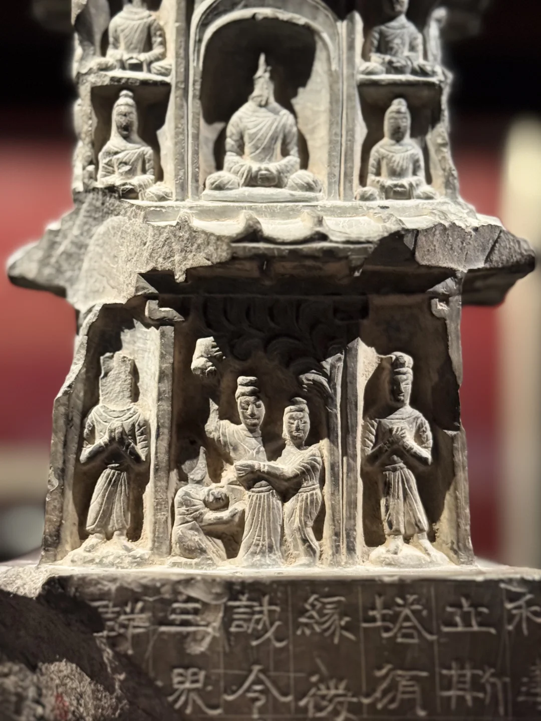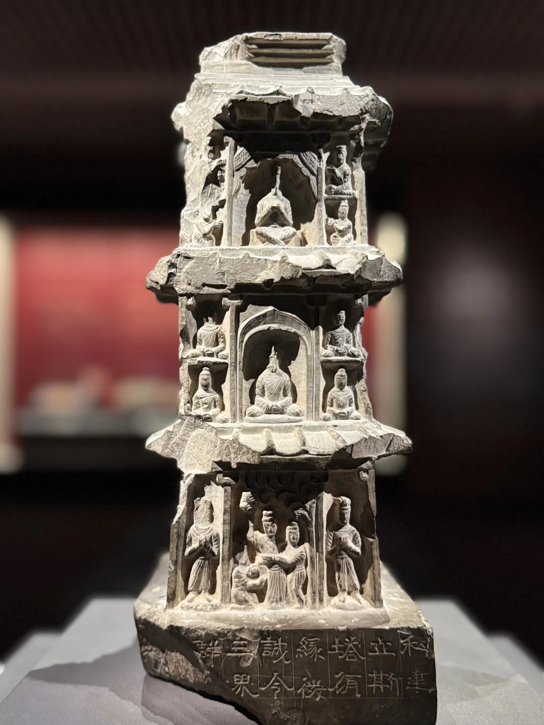 北魏石塔,又称北魏曹天护造像石塔。该塔为方形三层楼阁式结构,由基座、塔身、塔刹三部分组成。塔身分三层,每层有塔檐覆盖,檐角上翘,雕出瓦垄、斗拱和屋脊。塔身每层四面皆雕圆拱形佛龛,龛内共刻佛像12身。第一层为释迦诞生、九龙灌顶、释迦成道、释迦多宝并坐像;第二层为弥勒说法像;第三层为交脚弥勒,双树龛苦修等。该塔造型独特,雕凿精美,仿木结构的楼阁式造型,再现了中国早期佛塔的构筑特征。其造像风格、形制与北凉石塔明显不同,是我国现存为数不多的佛教造像方形石塔。