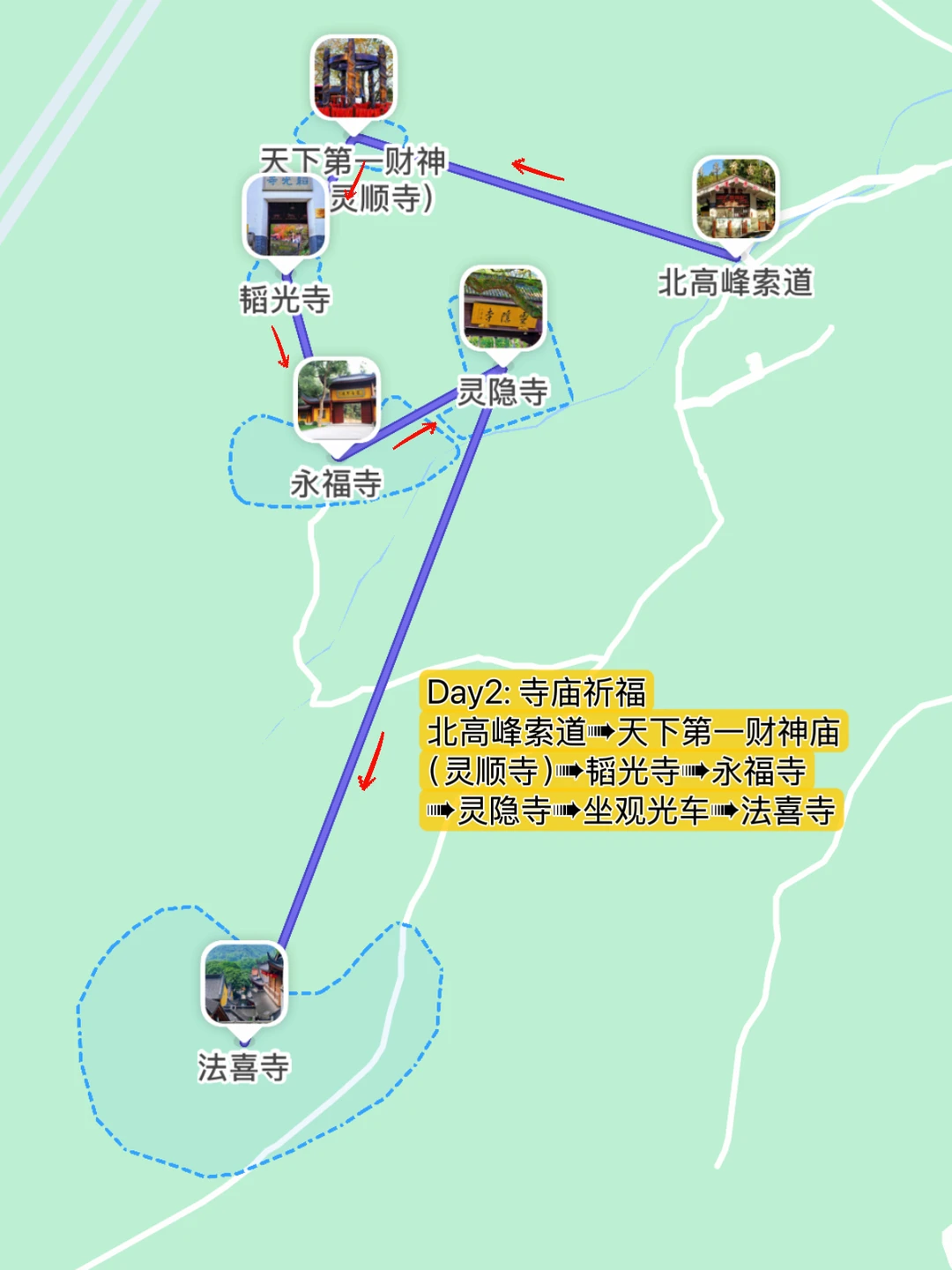 👉Day2: 北高峰索道➠天下第一财神庙(灵顺寺)➠韬光寺➠永福寺➠灵隐寺➠坐观光车➠法喜寺