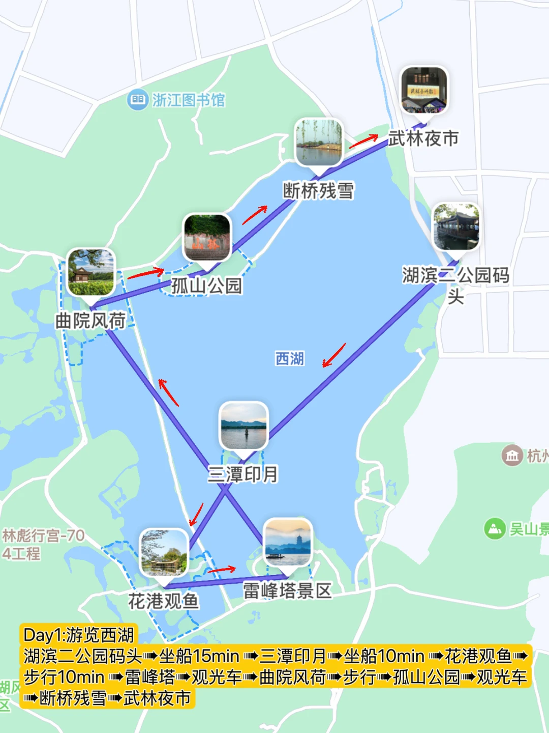 👉Day1:湖滨二公园码头➠坐船15min ➠三潭印月➠坐船10min ➠花港观鱼➠步行10min ➠雷峰塔➠观光车➠曲院风荷➠步行➠孤山公园➠观光车➠断桥残雪➠武林夜市