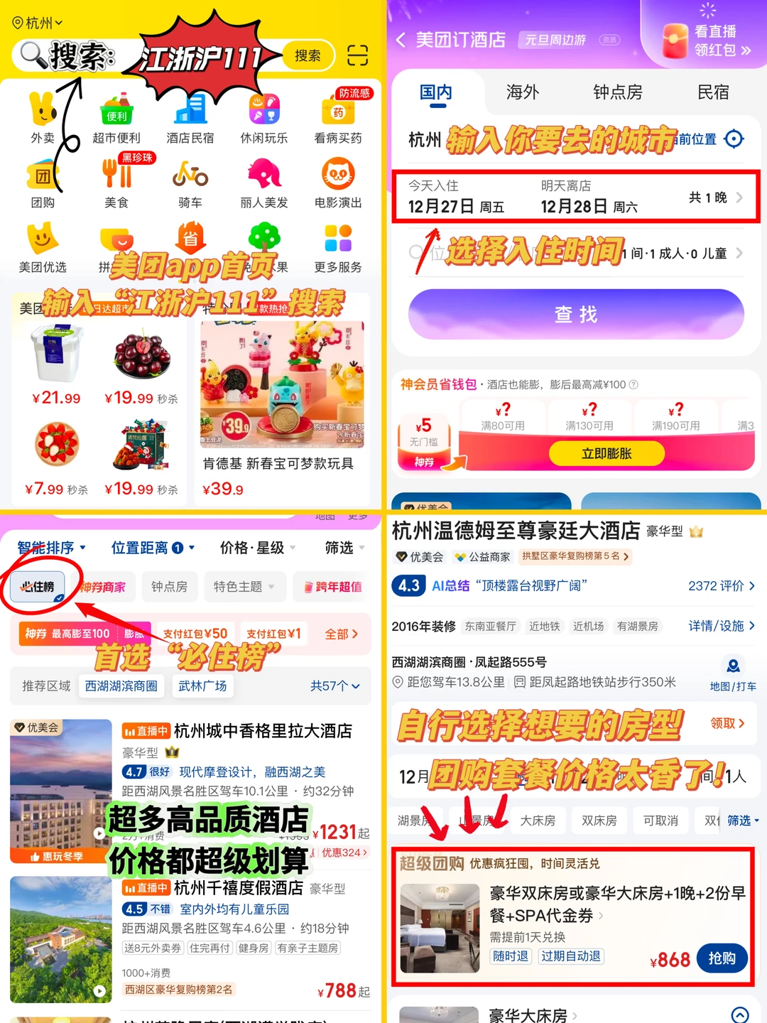 ▶ 现在点击👇左下角按钮或美团搜索🔍【江浙沪111】,即可进入活动页面,美团大牌会场有超多高品质“必住榜”酒店,盲选都不会踩雷!我这次订的“杭州温德姆至尊豪廷大酒店”,离西湖只有步行10min的距离,而且还是一家老牌酒店,环境设施和服务品质都没得说!团购套餐只要💰868,还包含了早餐和SPA券,酒店入住和退房流程也很便捷,整个入住体验真的超级棒!🥳