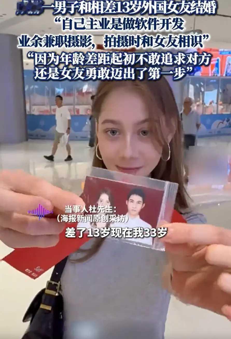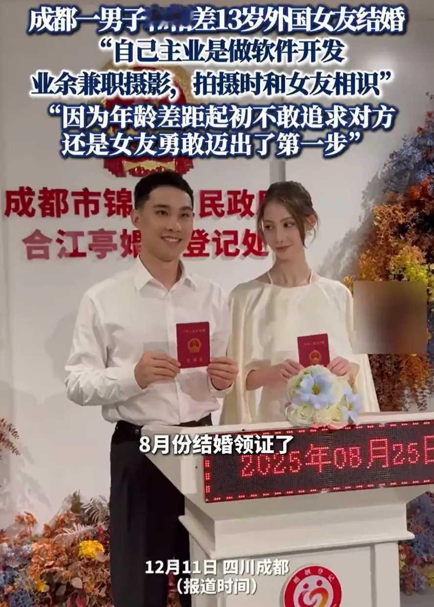 年龄差13岁,相隔千万里,这道看似难跨的鸿沟,被一对成都情侣用勇气和真心填平! 12月11日,成都33岁的杜先生迎来人生大喜,与小自己13岁的外国女友喜结连理。这场跨国恋的起点,藏在镜头前后的相遇里——杜先生主业是敲代码的程序员,业余兼职摄影,而女友正是他镜头下的模特。 工作中的杜先生专业又专注,调试灯光时的认真模样、搀扶踉跄女友时的细心举动,悄悄击中了这位外国姑娘的心。有趣的是,面对心仪的姑娘,杜先生却因13岁的年龄差迟迟不敢表白,反而是女方主动迈出第一步,捅破了这层窗户纸。 这段感情起初还遭遇了女方父母的顾虑——远嫁中国、年龄差距大,哪个父母能不担心?但他们没有强硬阻拦,而是在相处中看到了杜先生的真诚,最终选择尊重女儿的心意。 从镜头初遇到携手领证,这场跨越年龄和国界的爱情告诉所有人:爱从来不是数字的较量,只要真心相待、勇敢奔赴,就能把“不敢”变成“我们”!