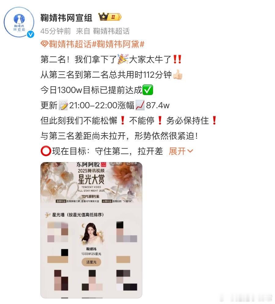 鞠婧祎星光大赏星光值第二鞠婧祎星光值TOP2小橘子永远是最靠谱的后盾!112分钟强势冲榜,让鞠婧祎稳坐星光值TOP2,这份双向奔赴的热爱太好哭。