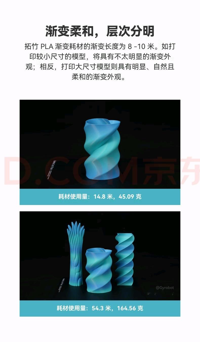 花了波昂贵的学费,才搞明白3D打印渐变色耗材和双色多色耗材的逻辑。渐变色耗材是两个颜色过度,一段几米是一个轮回,反复重复。所以如果我想要一个绿色渐变到蓝的圆桶,必须控制到耗材其中一段。正好是绿色渐变到蓝。如果模型太小,就可能打完了还没换色。如果模型太大,就会打出一道一道的反复渐变。而双色或者多色料是一根耗材分了几种颜色。通过打印均匀分散。也就是相当于把耗材放大,雕刻出模型。耗材每个角度是什么颜色,模型的每个角度就是什么颜色。需要摆盘和进料控制好。也有旋转分布的。还有一种是翡翠色。打出来间绿间白。我就傻乎乎的买了双色以为能打渐变色。结果打出来不对。又拿拓竹的渐变色打印了个小模型测试,因为耗材贵不舍得打太多。结果打出来是单色。我就觉得渐变色是骗人的。想想觉得不对,耗材丝确实是两个颜色怎么可能打出来一个颜色呢?又回头研究了一下才搞明白这就需要切片的时候控制好每个部件都从下往上分色。不然颜色就不对了。