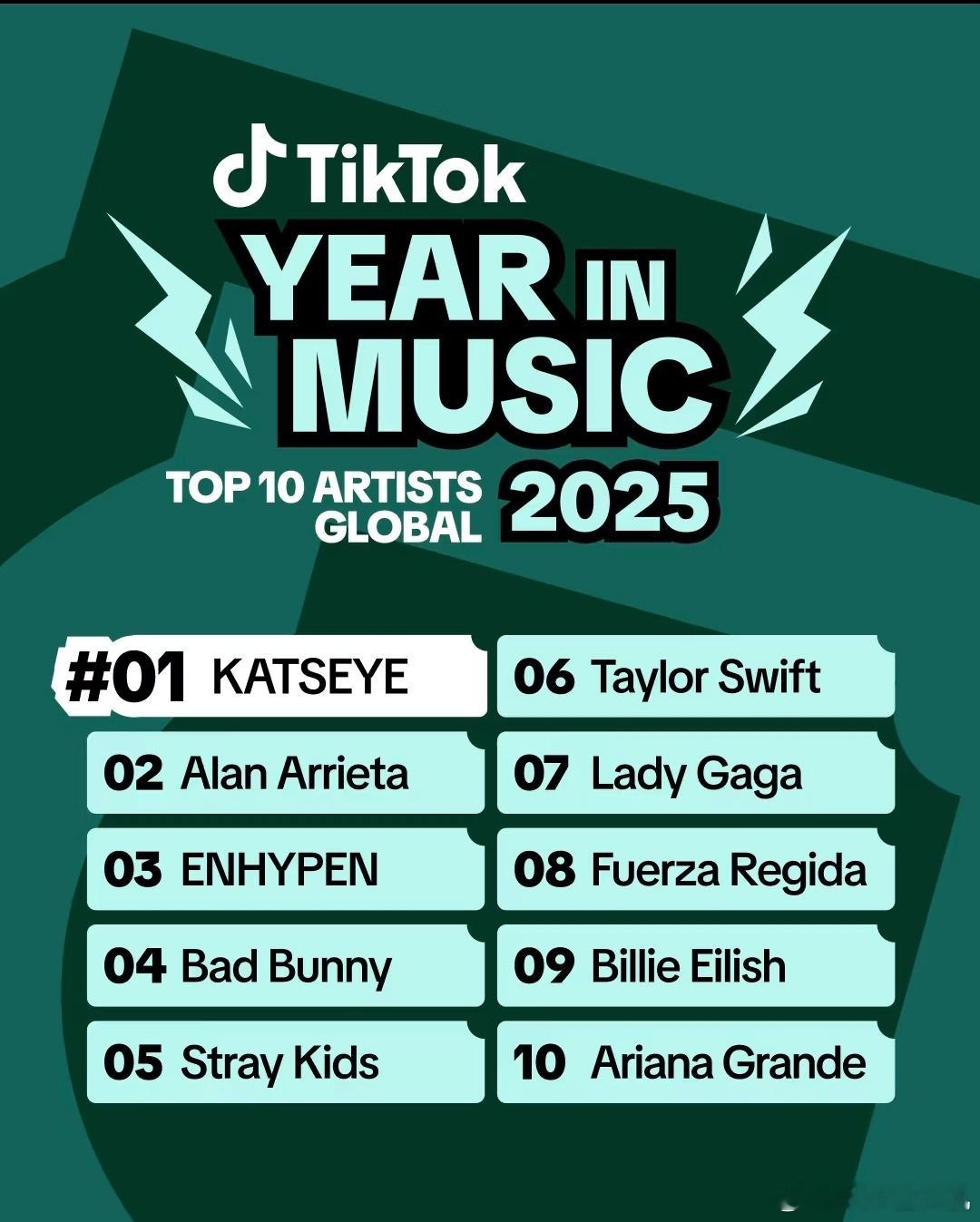 TikTok 2025年音乐年度榜全球十大艺人1KATSEYE (瞳) 2 Alan Arrieta (艾伦·阿里埃塔)3 ENHYPEN (符少年)4 Bad Bunny (坏痞兔)5 Stray Kids (迷路娃) 6 Taylor Swit (泰勒·斯威夫特)7 Lady Gaga (嘎嘎小姐) 8 Fuerza Regid (墨西哥乐队) 9 Billie Eilish (碧梨) 10 Ariana Grande (爱莉安娜·格兰德)