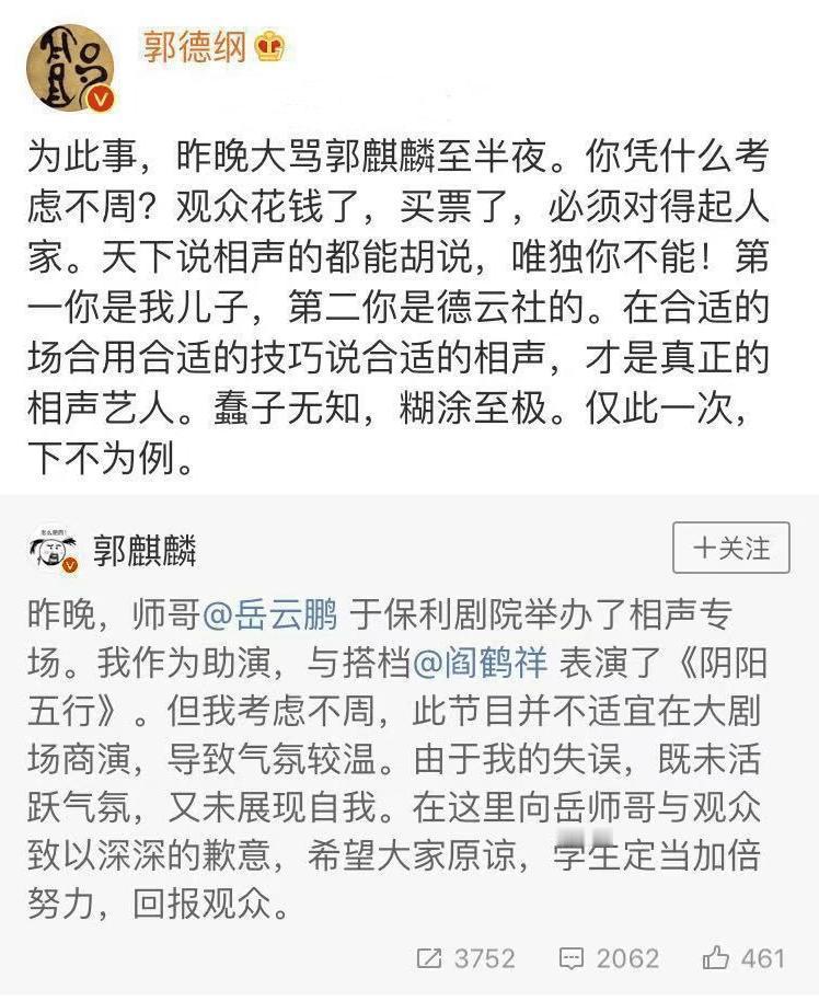 两个儿子两种教育,郭德纲真的有做到一碗水端平? 郭麒麟和郭汾阳虽然都是郭德纲的儿子,但是很明显从小有妈妈王慧护着的郭汾阳待遇和郭麒麟完全不一样 十岁的郭麒麟就要接受郭德纲的严格教育了,学相声,家里和剧组里都是端茶倒水的份 郭汾阳也学习相声,但是郭德纲对小儿子实行的是快乐教育,以孩子开心为主,看着郭汾阳骑水上摩托还有无人机专门拍照,的时候这开心的模样就知道有多无忧无虑了 对于郭麒麟来说家不是他的家,没有自己的房间,郭德纲甚至都比不上师父于谦,郭德纲只是郭汾阳的父亲