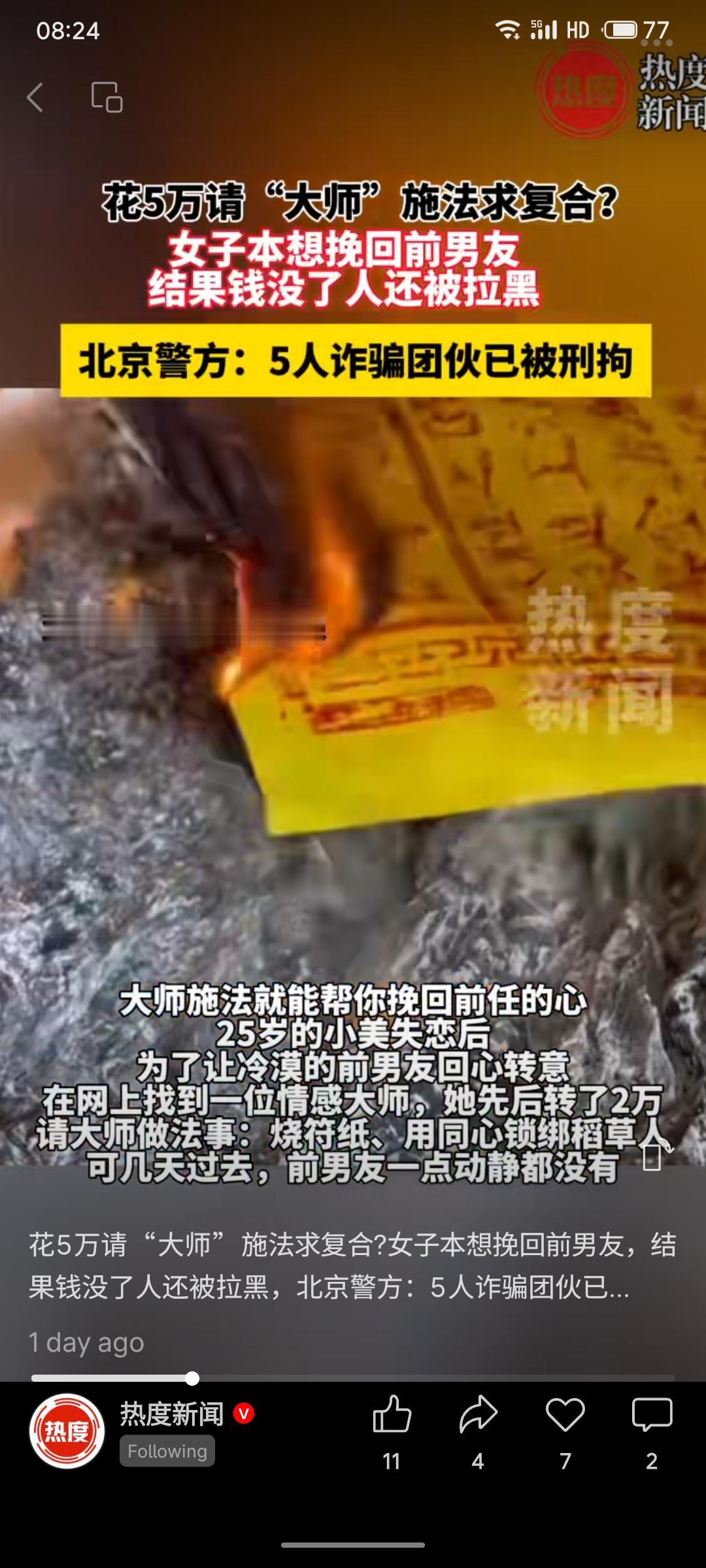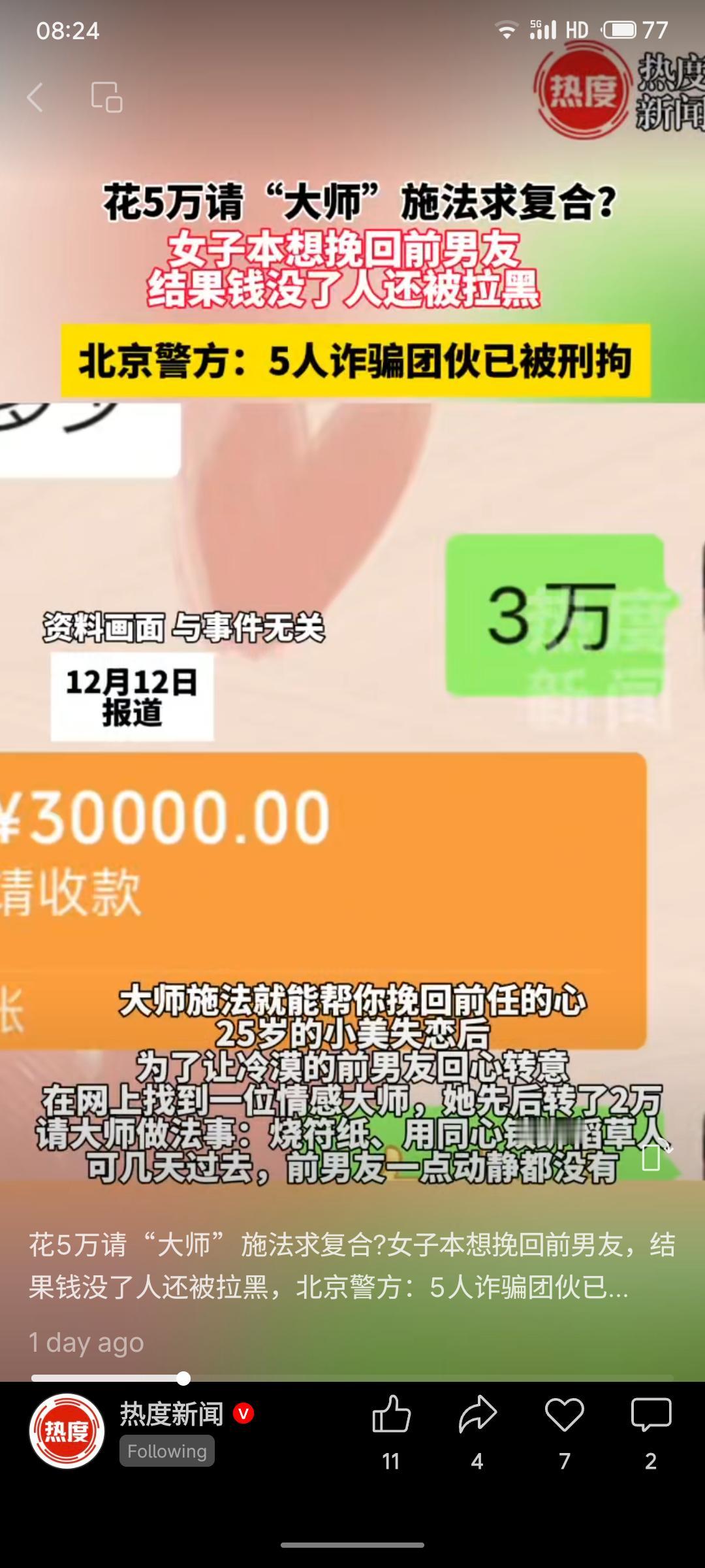 北京一25岁女子为挽回前男友,轻信网络“情感大师”,花费5万元请求“施法”,未料对方收钱后失联。海淀警方调查发现,这是一个专门针对失恋人群行骗的5人团伙,目前嫌疑人已被依法刑事拘留。