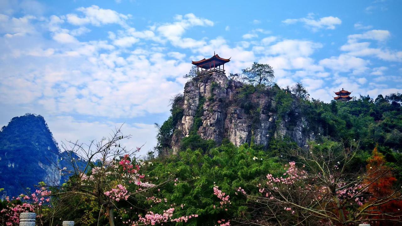 🌸云絮在蓝天写着诗,古亭在山巅做着梦,脚下的粉花簌簌开着,把天地的灵秀都酿成了眼前的浪漫。 ✨石峰撑着飞檐,接住了蓝天与流云,繁花在山脚漫成粉色的雾,山水间尽是中式美学的清欢与悠长。