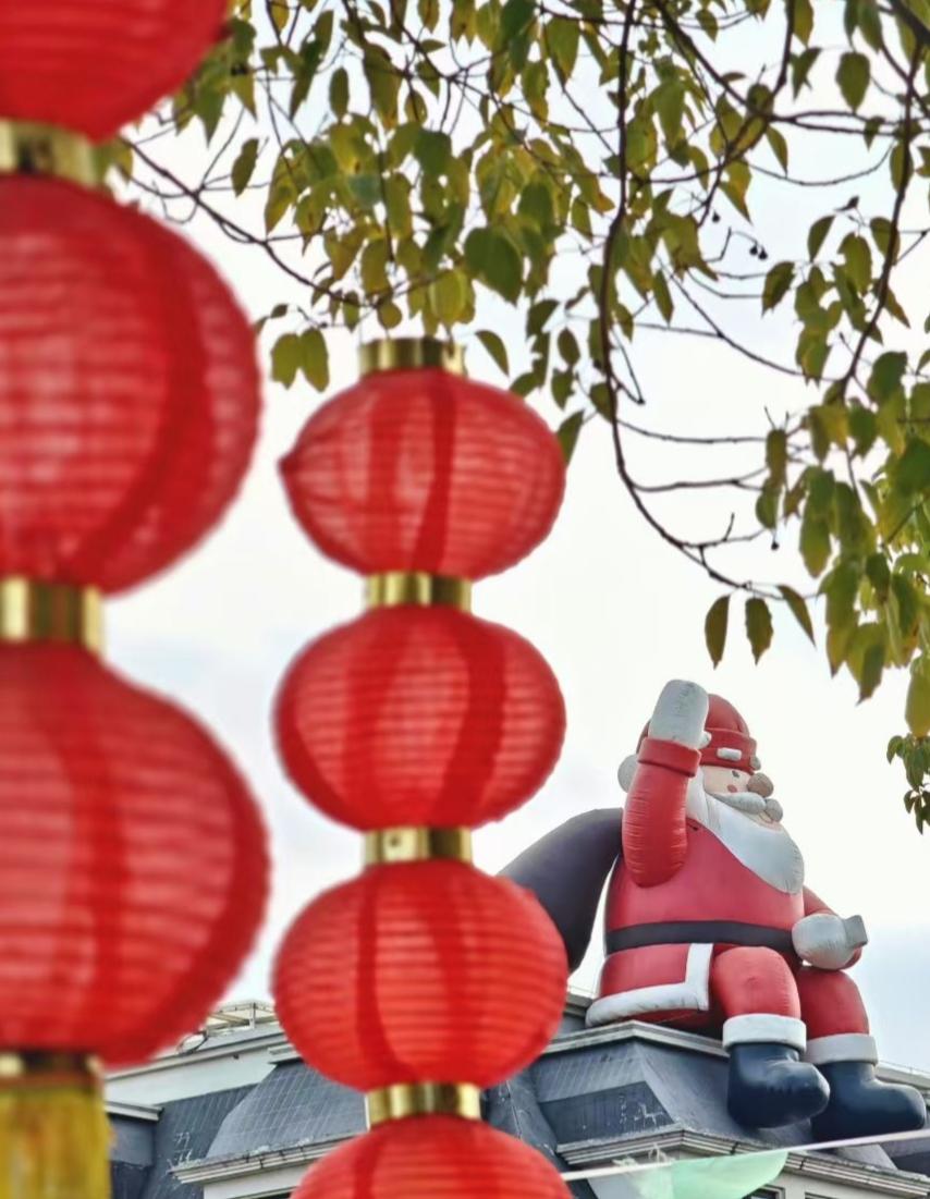 冬日暖阳润大地, 宝鼎天穹飞纸鸢。 又是圣诞守岁时, 红灯高悬迎新年。