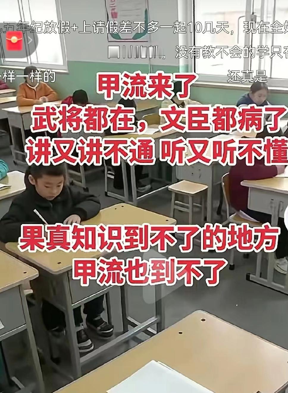 班里“文臣”全躺平,“武将”照常来上学?甲流段子背后是科学鸿沟 最近学校甲流闹得凶,孩子们编出新段子:“班里文臣全军覆没,武将屹立不倒。” 学生回家还调侃——妈妈,老师的心腹全病倒了,教室里剩的全是“心腹大患”! 听起来荒唐,细想真扎心。那些乖乖听讲知识扎实的孩子,那些认真学习缺少锻炼的“文臣”,反而倒下一片。 倒是整天调皮的孩子,活蹦乱跳照常上课,病毒愣是绕着他走。 这事儿挺黑色幽默的。知识到不了的地方,病毒确实到不了吗? 正是知识到不了,病毒才来去自由。 那些所谓“武将”,要么天生抵抗力强,爱活动,要么纯属侥幸——可侥幸能当防护盾吗?下回换种病毒试试? 孩子们这调侃 “老师心腹”病倒,成为笑点,这警示着科学防疫不能停留在黑板。要加强锻炼增加抵抗力,病毒就不敢落地。 教室里坐着的每个孩子,都该既是“文臣”懂科学,又是“武将”能抗病。健康这事儿,从来不是靠运气闯关。 各位读者你们怎么看?欢迎在评论区讨论。
