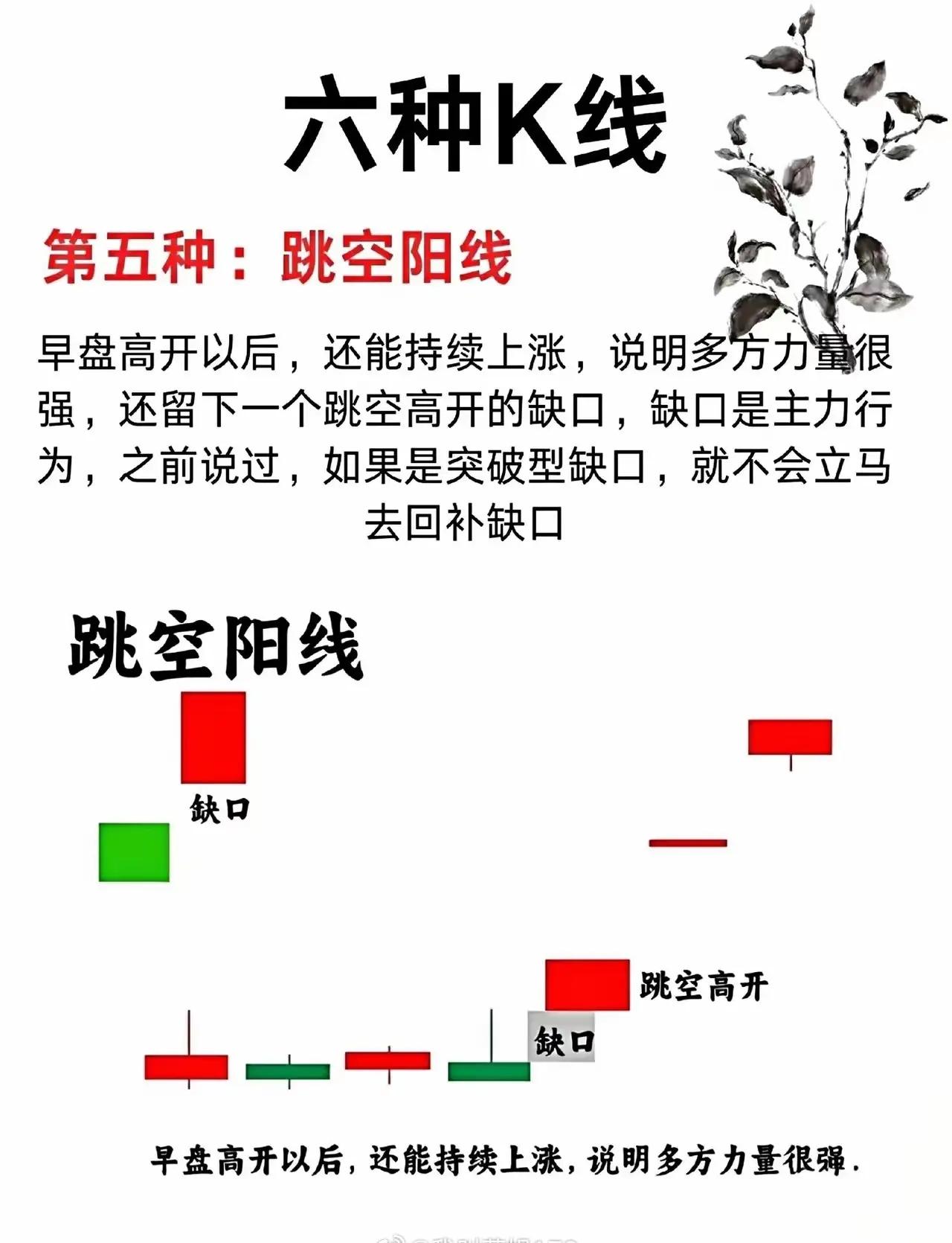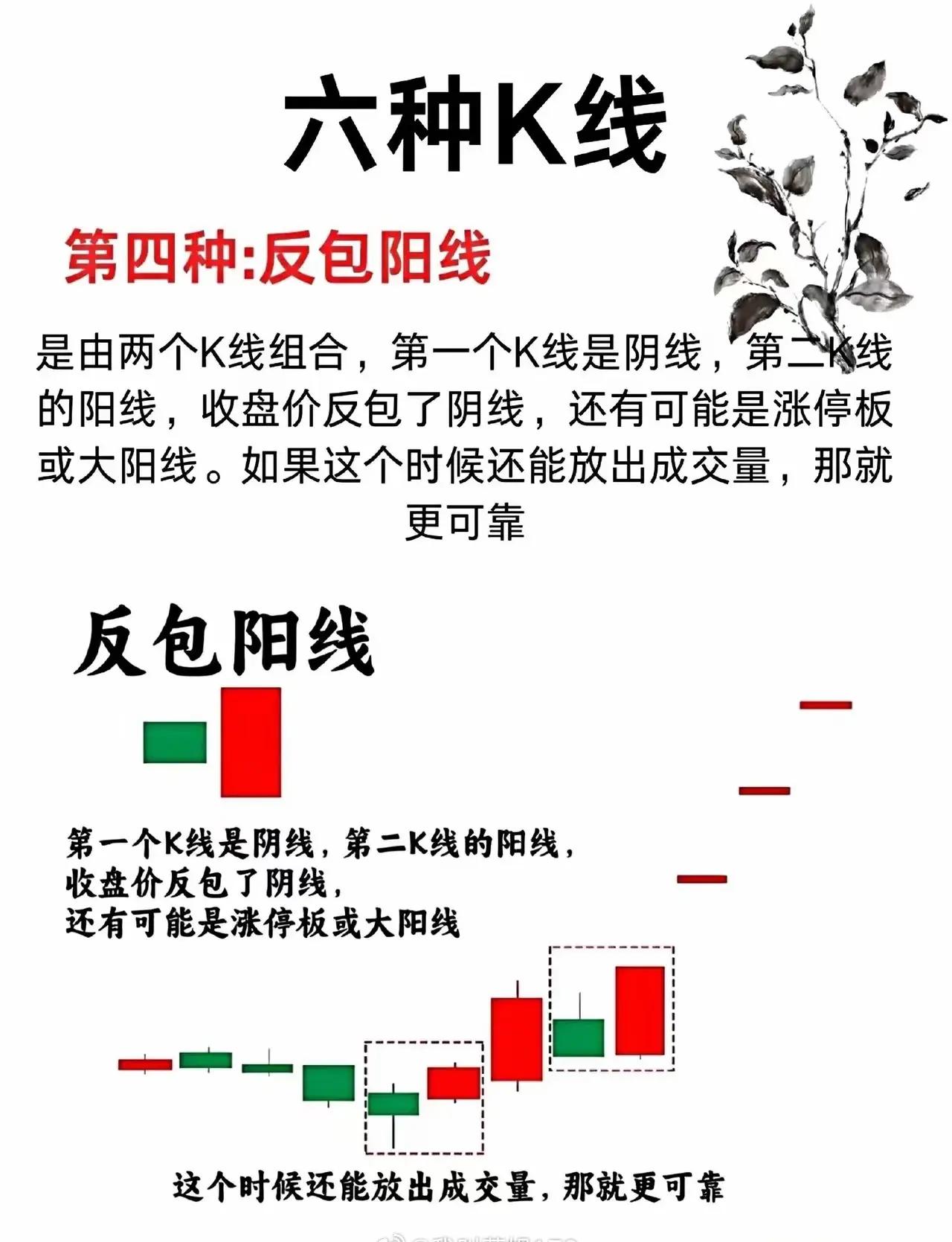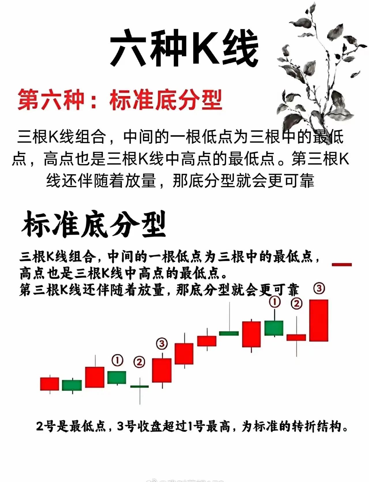 “六种K线”,系统介绍了其中五种K线形态的特征、含义及实战意义: 第一种:十字星线。其特点是开盘价与收盘价位于同一位置,反映多空双方力量暂时平衡。根据所处位置不同(低位、高位、上升途中),可体现不同的主力意图,是观察趋势转折的重要信号。 第二种:长下影线(又称单针探底)。当股价大幅下探后被快速拉回,形成带有较长下影线的K线,无论阳线或阴线,均表明盘中主力在维护当前价位,且该位置往往构成关键支撑。 第四种:反包阳线。由两根K线组成,第一根为阴线,第二根为阳线,且阳线收盘价完全覆盖前一根阴线的实体。该阳线可为普通大阳线或涨停板形态,若伴随明显放量,信号可靠性更高,常被视为趋势转强的标志。 第五种:跳空阳线。早盘高开后持续上攻,显示多方力量强劲,并留下跳空高开缺口。此类缺口多为资金推动的主动行为,尤其是突破型缺口,短期内不易回补,具有较强方向指引作用。 第六种:标准底分型。由三根K线构成,中间一根的低点为三根中最低,高点也为三根中最低;第三根K线若伴随放量,且收盘价超过第一根的最高价,则形成标准转折结构,底分型可靠性增强,常预示阶段性底部形成。 整体来看,这五种K线形态分别从多空平衡、支撑确认、趋势反转、强势突破及底部构筑等角度,提供了识别股价关键位置与潜在变化的技术参考。